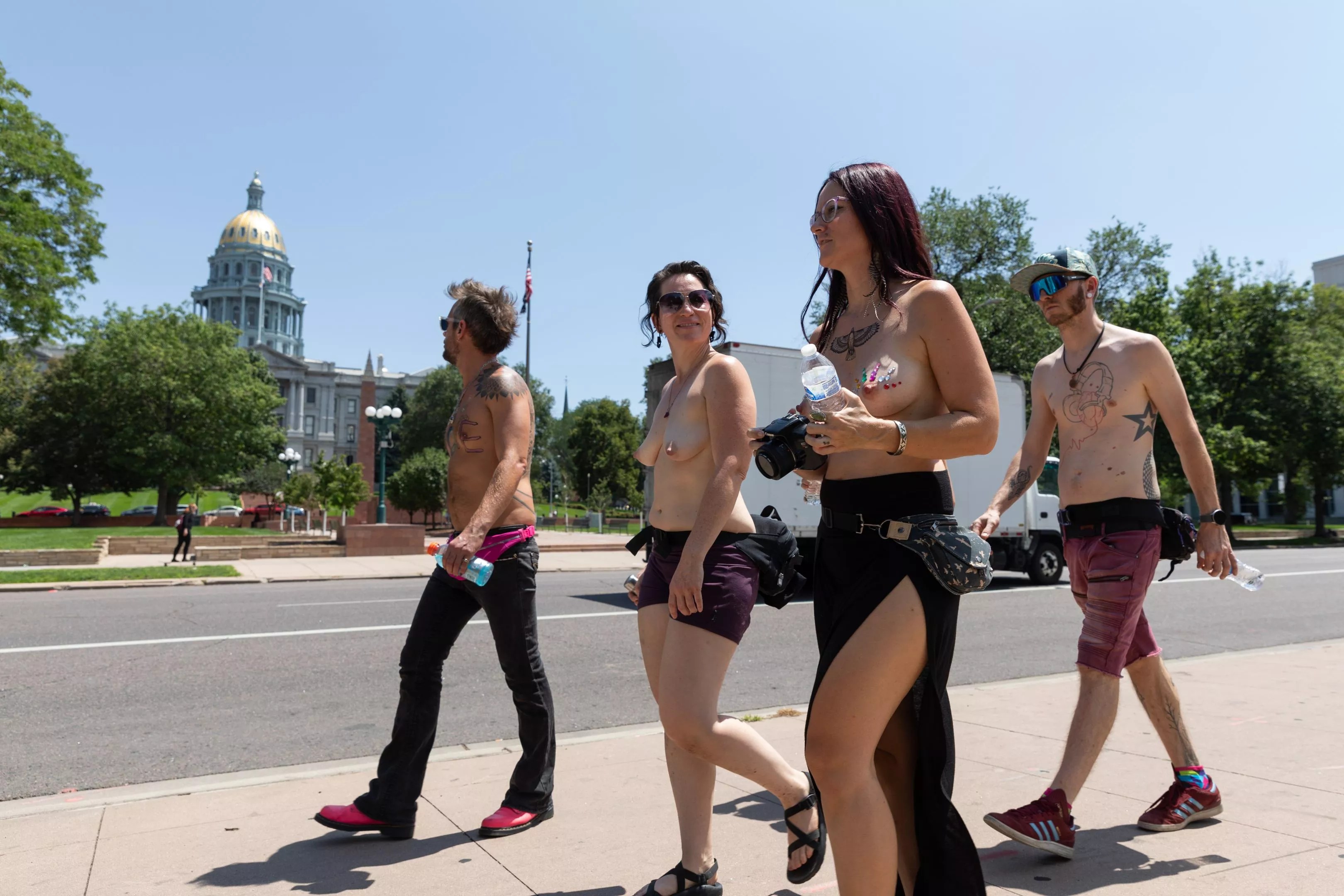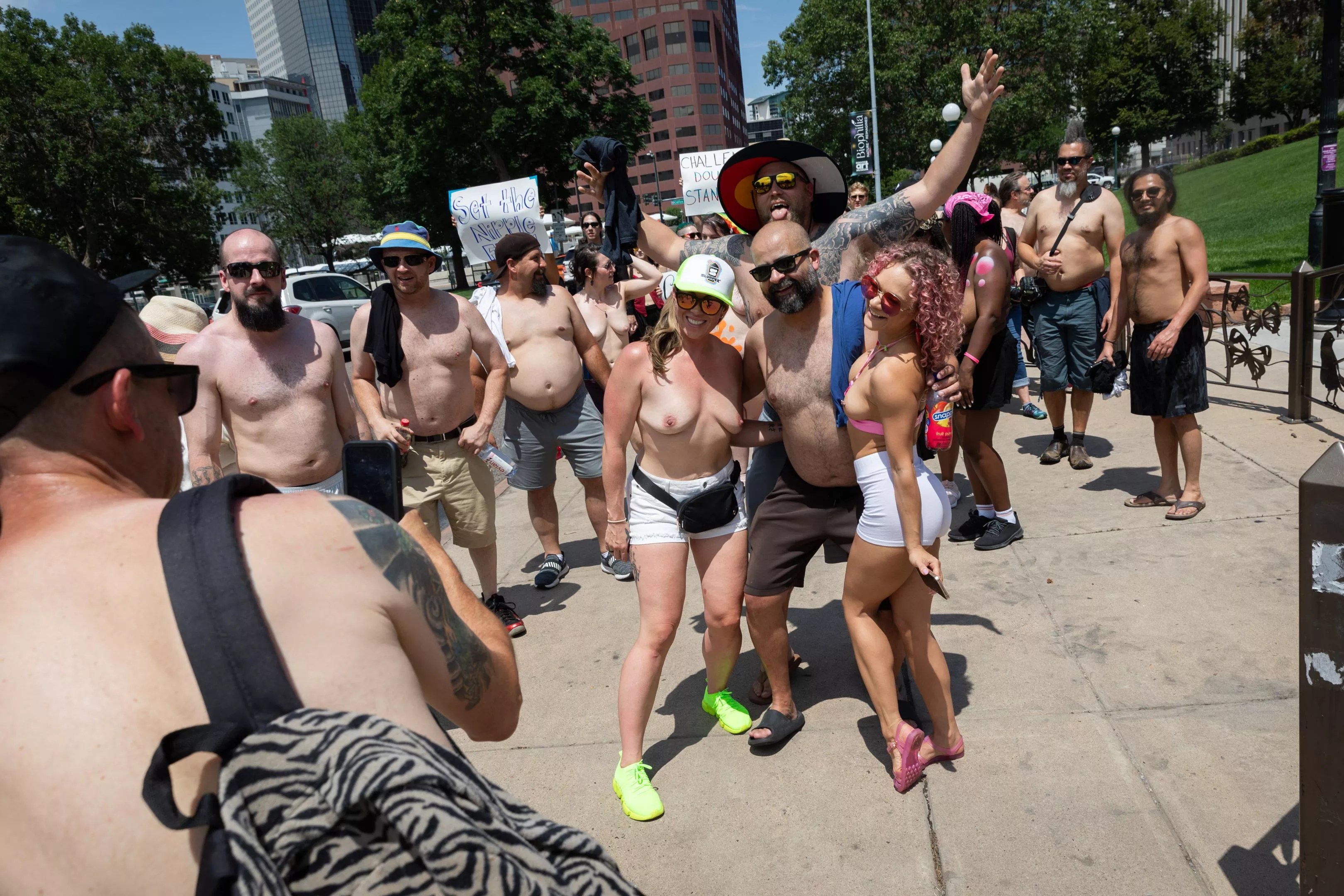 Denver’s GoTopless march returned this Saturday to Civic Center Park, where about 100 people gathered to celebrate topless equality. The event, which was first held in 2013, brought out a diverse crowd of many genders and races, some of whom bared it all, while some stayed covered up.