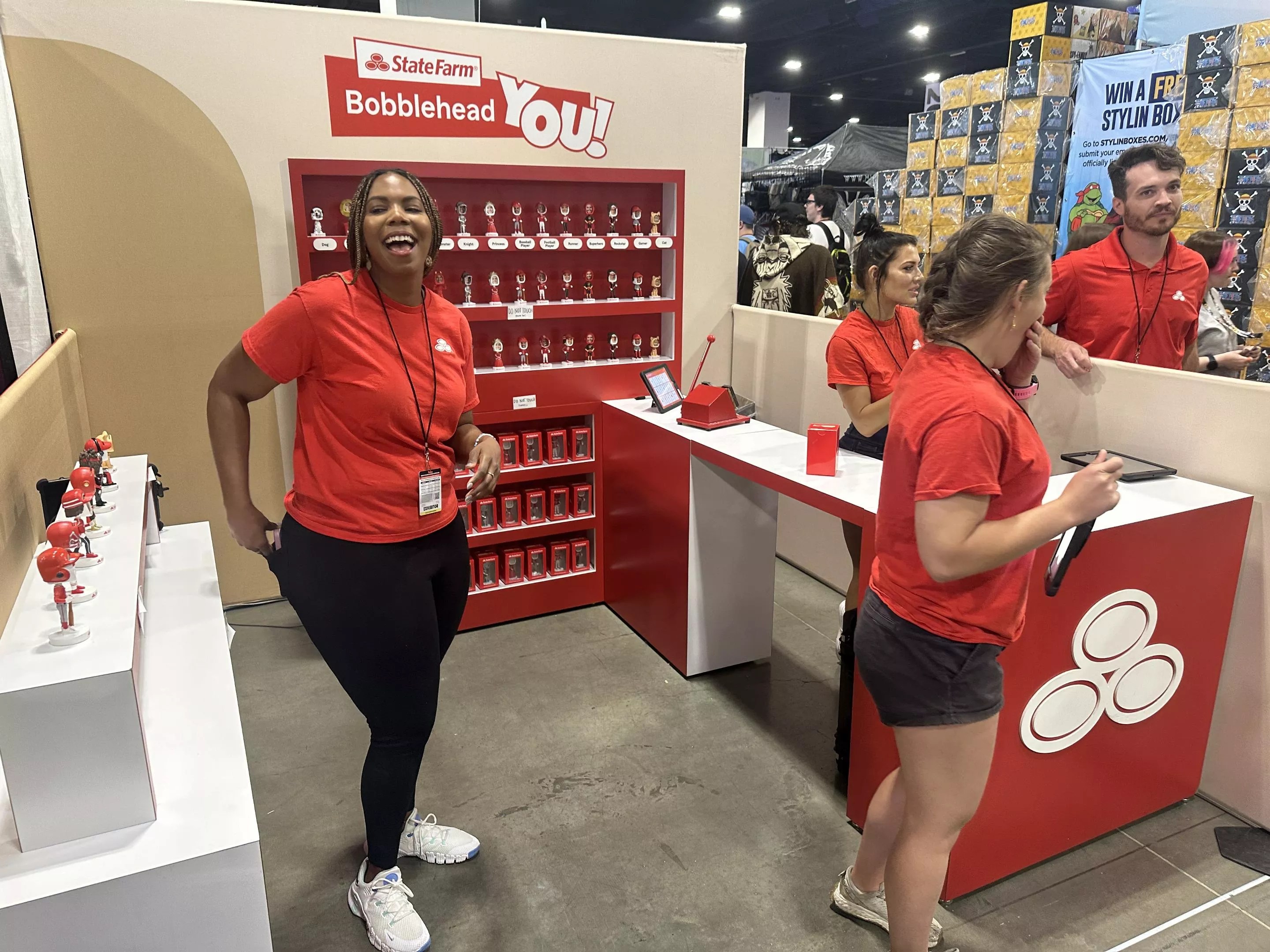 When you think comic books, cosplay, pop-culture, gaming and more, you, like the rest of America, think of insurance. Right? Well, no…but these lovely people all dressed in red (though one wonders why they aren’t wearing khakis) will give you a custom bobblehead. Why? Because “Bobblehead YOU!” is State Farm’s new slogan. And even if that’s not true, it makes this booth make a little more sense, so we’re going with it.