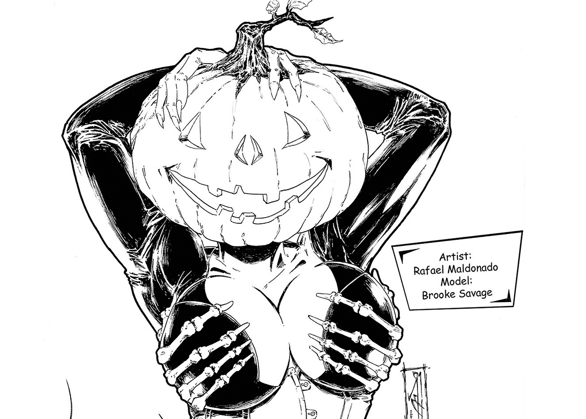 The collection is presented by the Colorado Festival of Horror and takes its cue from the many horror movie-inspired shoots that Asche has created with the Metal Maidens over the years. Primarily, the group is known for its portfolio of alternative modeling, as well as for community organizing and street team efforts supporting the Colorado music scene. Still, horror cosplay has always been one of the Maidens’ specialties. 24 Horror Pin Ups mixes horror, beauty, metal and monsters in a colorful love letter to the group and its history. Each participating artist uses the collective’s ample catalogue for inspiration, referencing specific photo shoots created by Asche during its twenty-plus years of work, when models have creatively riffed on everything from Michael Myers to Mr. Stay-Puft.