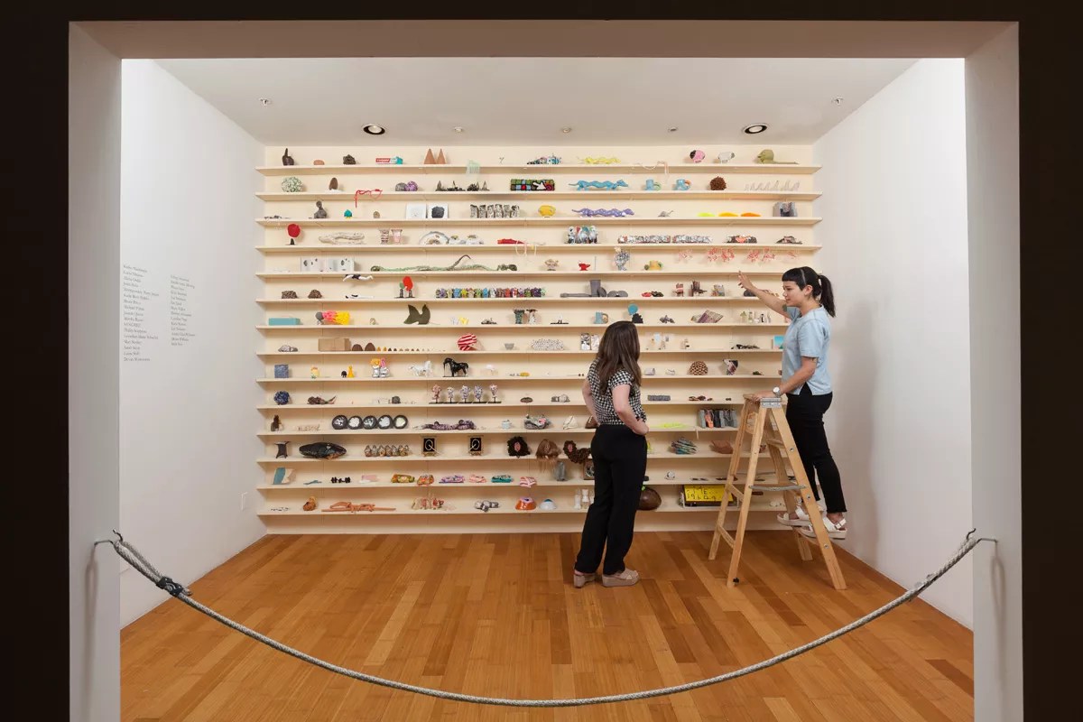 The exhibit comprises a set of shelves covered with tiny sculptures by invited artists, including many who work around town, and several of the individual components are extremely nice.