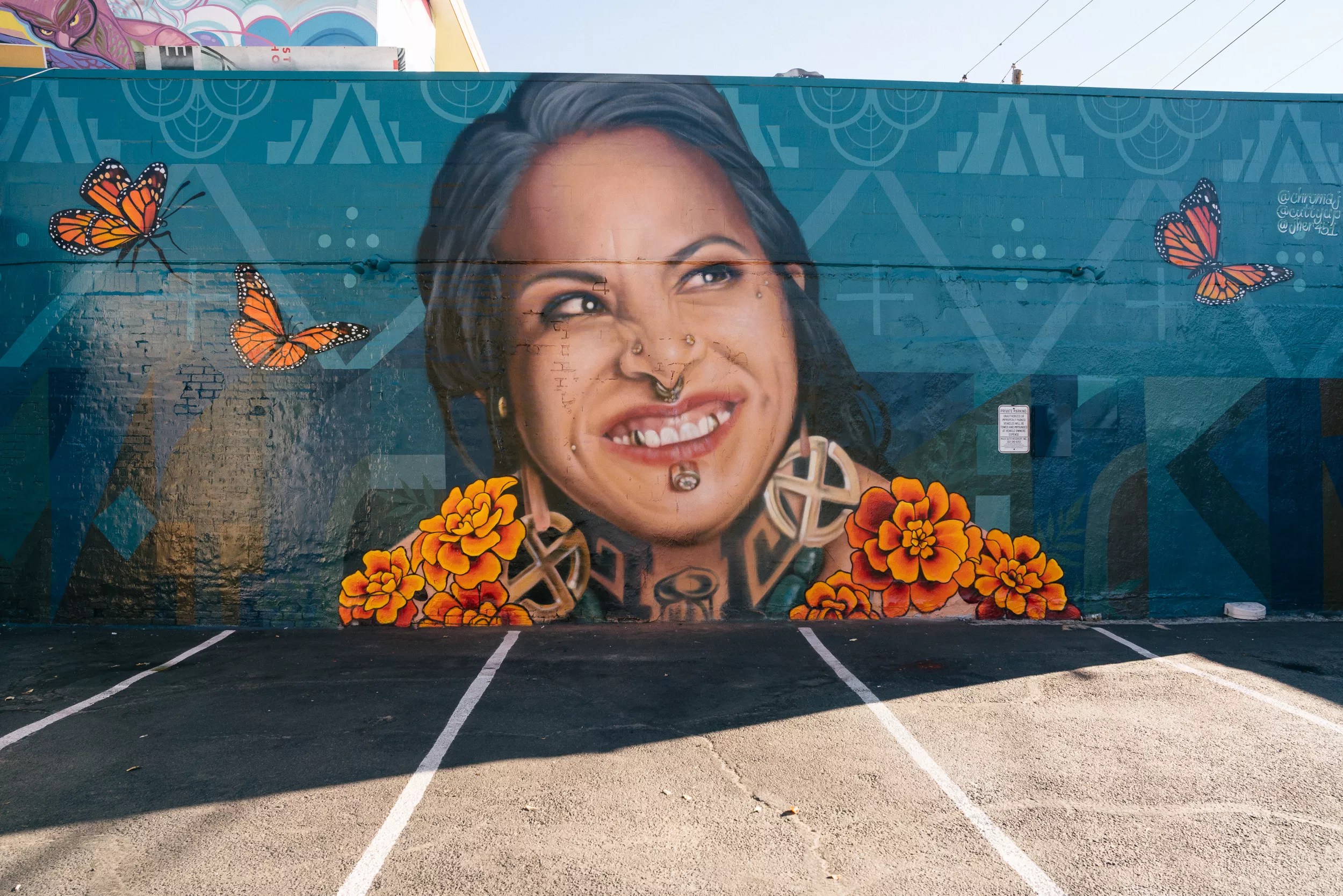 Herrera used her photorealism skills to paint the portrait of Cardenas for the mural. Jher added the monarchs and flowers. “My concept with the marigolds obviously was through Mexican tradition. When someone dies, they put the flowers in their house, and that way the soul can find its way back home,” Jher explains. “The monarchs are a part of that culture, too, because they fly from Mexico to America, then back in the course of their life.”