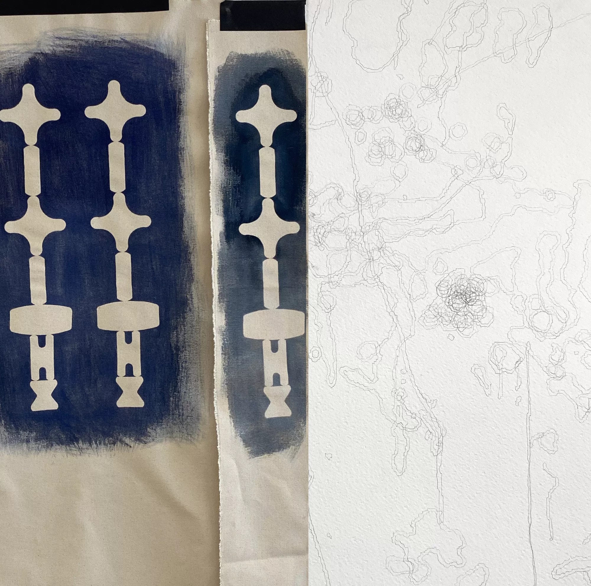 Colorado artists Marina Kassianidou and Maia Ruth Lee share a common theme exploring the relationships between language and mark-making from different points of view. For Kassianidou, the investigation is based on tracings from old school books – treasured heirlooms owned by her grandmother in Cyprus – while Lee inks out her own experience in a long banner adorned with the silhouettes of bandages.