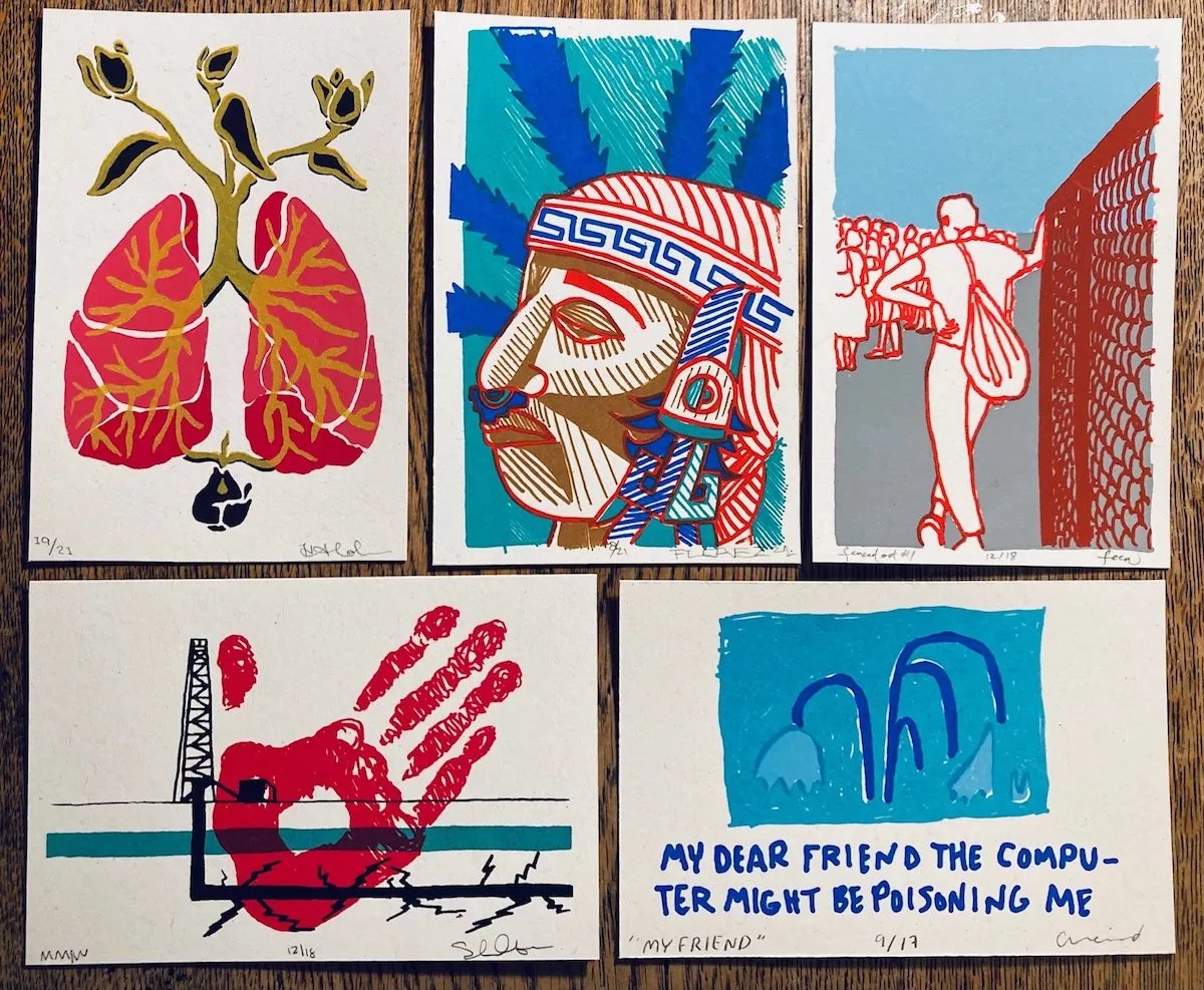 Not far from Pablo’s, the Artisan Center in Cherry Creek North performs another minor miracle for Mo’Print by focusing on letterpress, a process often used for functional uses, including handmade greeting cards made by artists. This exhibition is viewable through the window, and everything is for sale, including cards by the Artisan Center’s owners and 2022 Mo’Print director/artists Jennifer Ghormley and Emily Moyer.