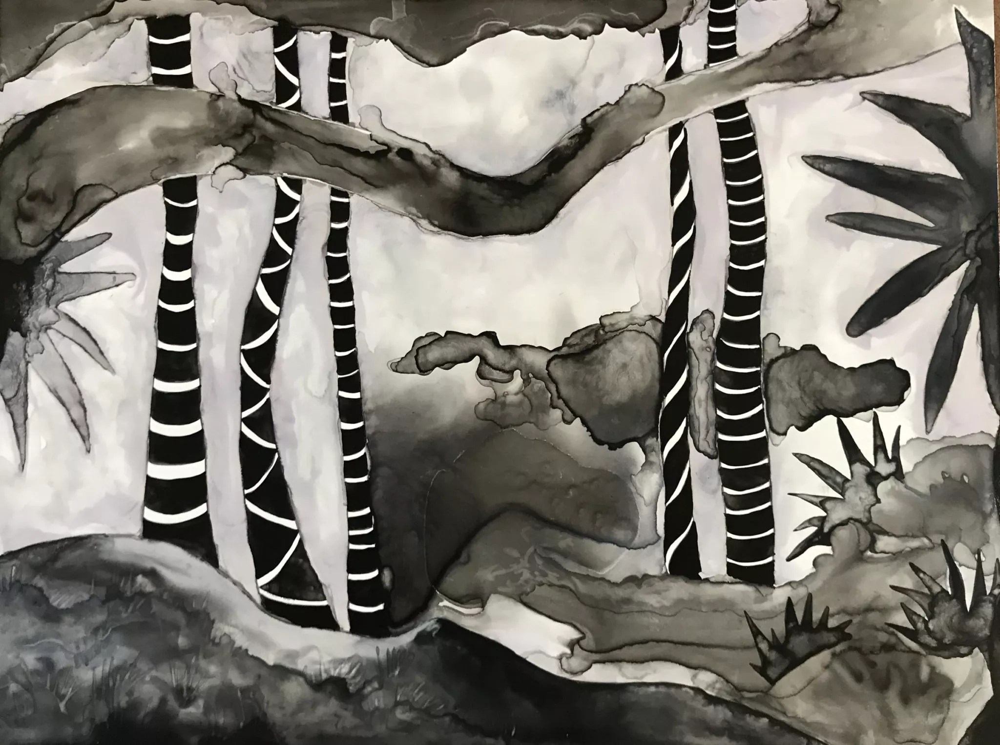 Edge Gallery is packed this month with art from members both new and returning. Gayla Lemke forgoes clay here for monochromatic watercolor drawings from nature; Mark Farrell contributes large, color-saturated representational oil paintings on canvas that tell spooky stories; Travis Vermilye blends digital art and short films capturing fruiting bodies of molds and slime molds in transition (fun stuff!); Eric Havelock-Bailie, an original Edge member who’s just returned to the fold, shows paintings and photographs from the San Luis Valley; and another new member, Mark Brasuell, is hanging a series of abstract watercolors on paper titled Last Year Everyone I Knew Died.