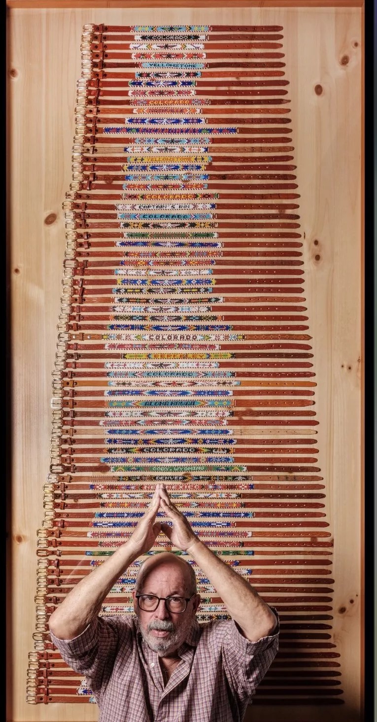 Denver”s “Famous Artist” Phil Bender poses with a collection of beaded belts.