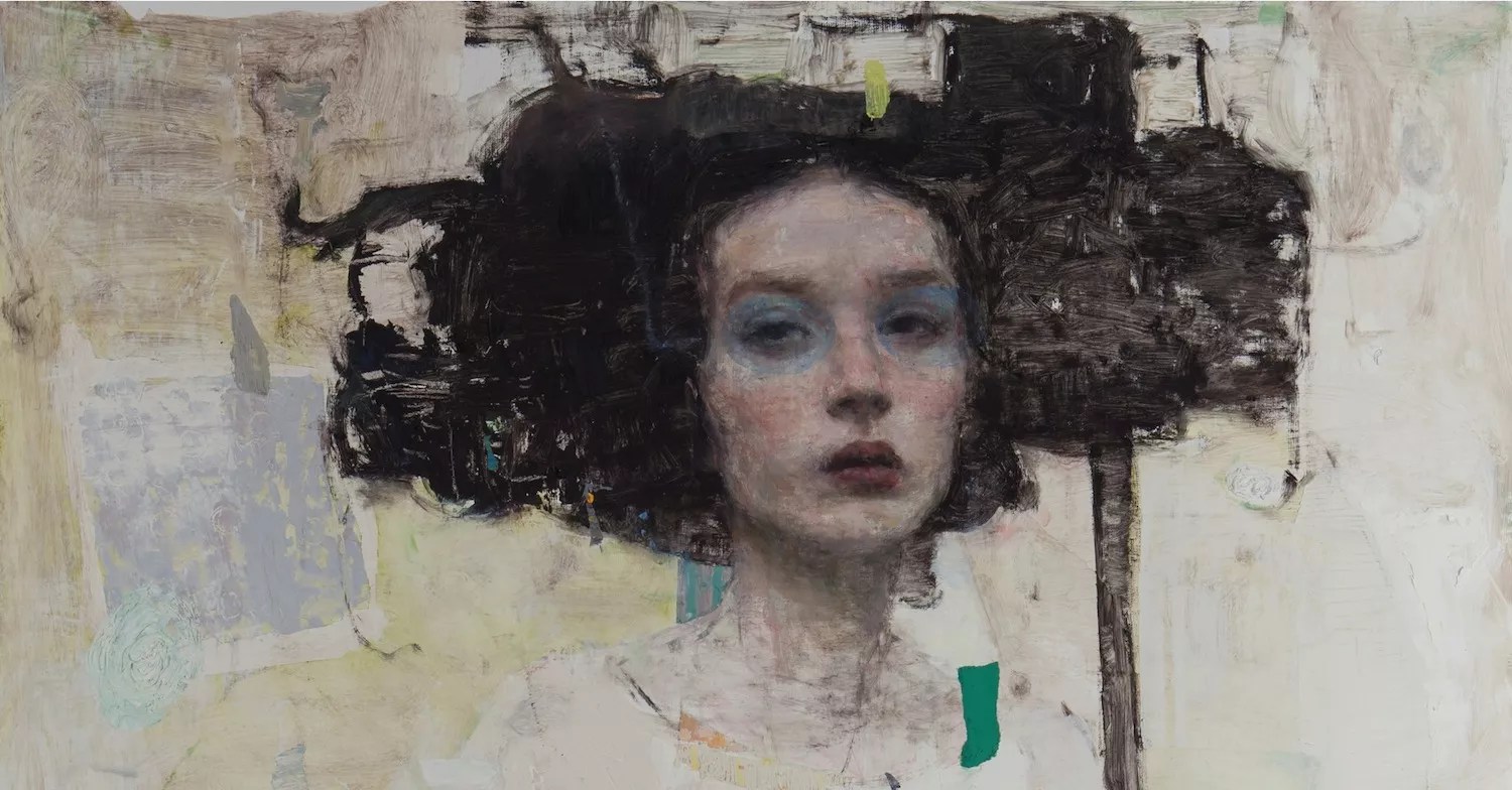 Cara Enteles, “A Second Look,” oil and silkscreen on aluminum panel.