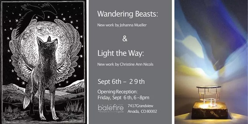 A printmaker and a metalsmith take divergent routes in their approach to the human footstep in the midst of nature: Fort Collins-based storyteller Johanna Mueller offers prints of animals framed by mythology and symbolism, while Christine Ann Nicols blends earthy elements of metal and geode crystals with LED lights to create one-of-a-kind lamps.