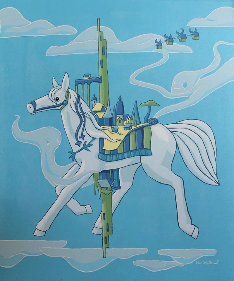 Salida-based artist Karen Watkins is down from the hills to show off a new batch of her woodsy, pop-surreal paintings of animals and wild places as a gallery guest at Valkarie. There’s a touch of anime style to the series, which riffs off the idea of decorative carousel animals let loose in the wild.