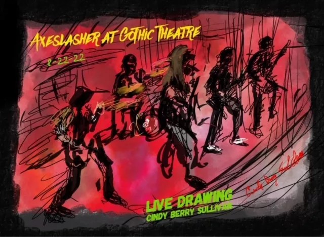 Cindy Berry Sullivan isn’t a metalhead – or a musician, for that matter. But after attending a show at the Gothic Theatre over the summer, the Parker-based artist couldn’t help but appreciate the intensity that the metal bands created that night. She captured the lively scene in four digital drawings of the acts on the bill: Axeslasher, Enforced, Municipal Waste and At the Gates.