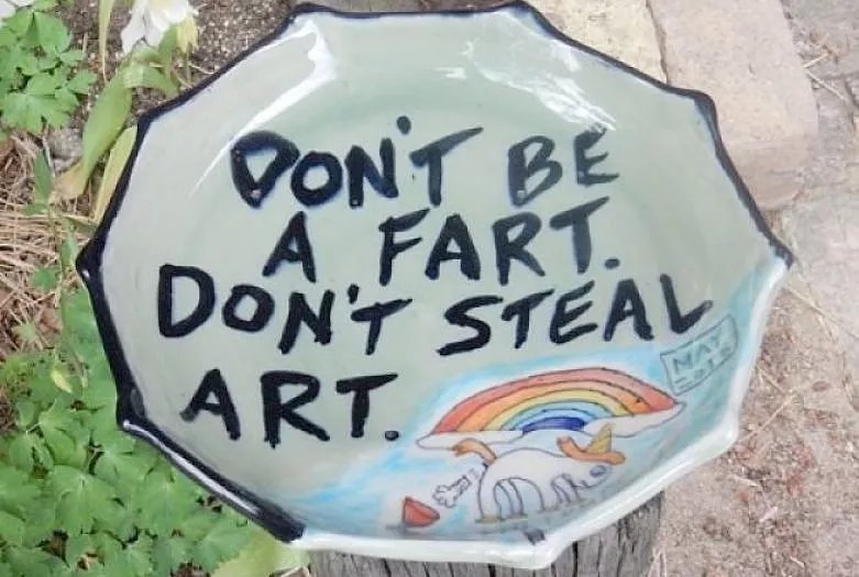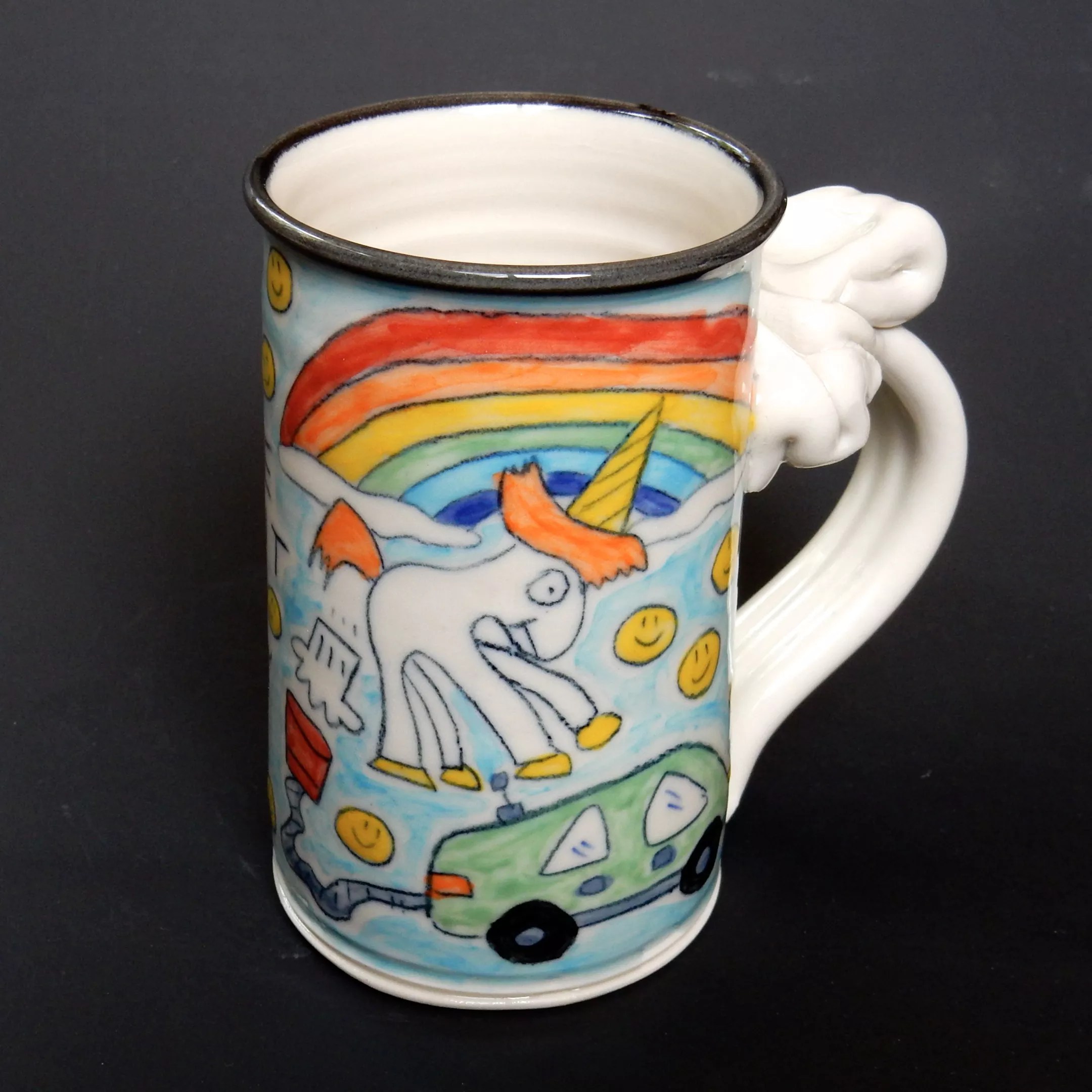 The popular Twitter feed @forexposure.txt frequently features people’s arguments about why they shouldn’t pay artists, ranging from “not all artists do it for financial gain” to “I didn’t steal it, it was on the Internet.” Still, it was surprising to see billionaire entrepreneur Elon Musk making the same kinds of arguments when confronted on Twitter by Lisa Prank, aka Robin Edwards – daughter of Evergreen potter Tom Edwards, whose Wallyware ceramics have made their way around the world. One mug in particular, showing a unicorn farting into a tube and powering an electric car, wound up in Musk’s possession, and he tweeted about it in February 2017, calling it his “favorite mug ever.”