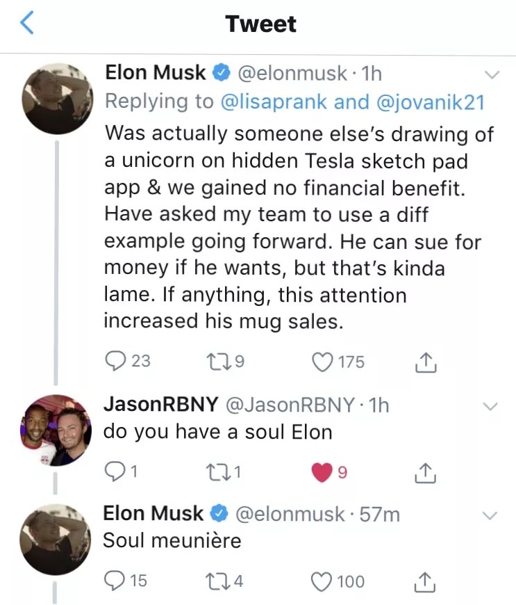 After a copy of Edwards’s work wound up on the Tesla sketch pad as a clear part of the company’s branding, Edwards’s lawyer crafted an unbelievably gentle letter to Musk and Tesla…which went ignored until Lisa Prank’s tweet. Musk’s response, since deleted, was a sadly typical response to an artist’s request for compensation: “He can sue for money if he wants, but that’s kinda lame.”