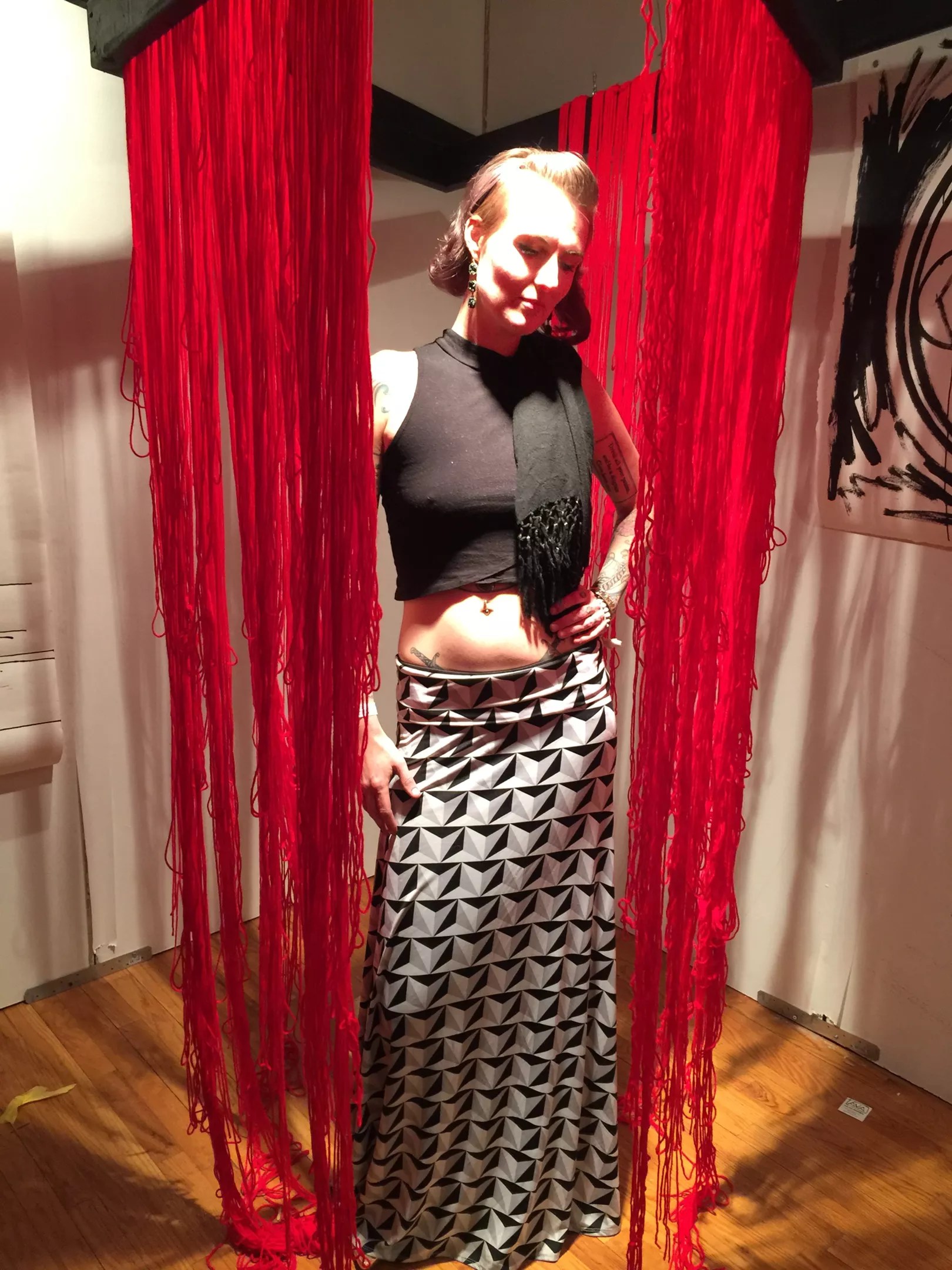 Artist Ava Van Deursen in her installation at Artopia 2017; she’s wearing a Lula Roe patterned skirt and a top from Ross.