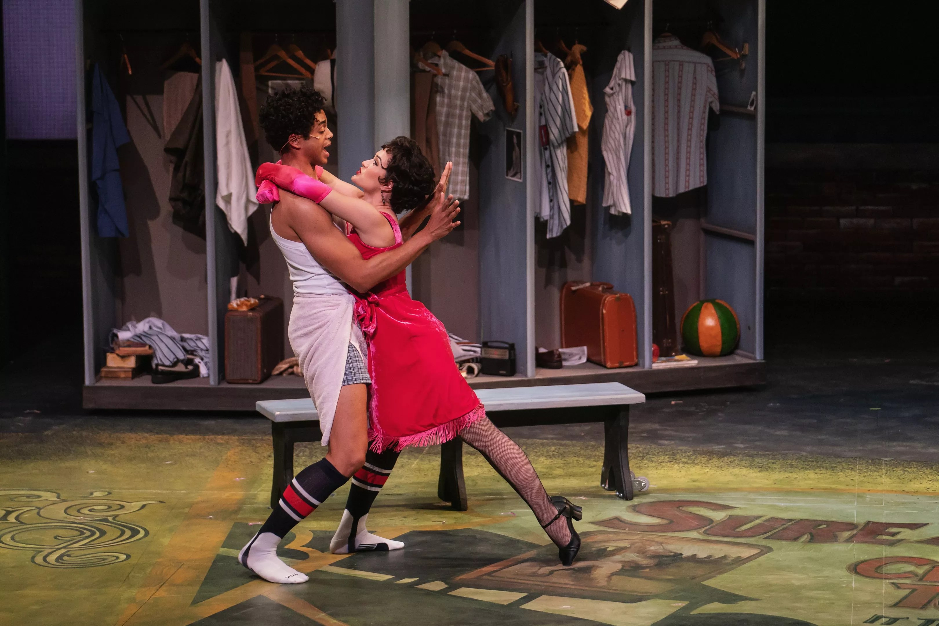 Ty-Gabriel Jones, who plays Joe Hardy, attempts to resist Adriane Leigh Robinson’s advances in the locker room during “Whatever Lola Wants.”