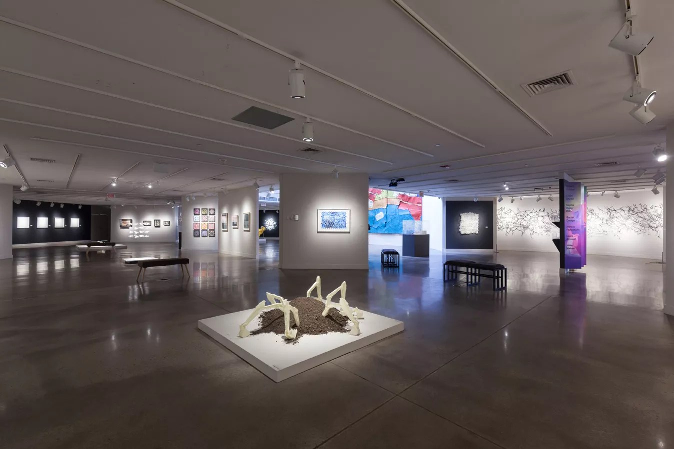 Key to pulling unity out of this diversity was Parson’s decision to ask certain artists to create site-specific works in high-profile spots especially for this show. The first of these, on the curved wall in the otherwise awkward entry gallery, is “Two Months and Twenty Snails, Roughly.” As partly suggested by the title, artist Lauri Lynnxe Murphy placed twenty snails on a large sheet of black paper; they left trails of slime as they moved across it, and Murphy cut those out and mounted them on the wall. The result looks like a decorative grill, its linear elements taking on an automatist composition – but since it was snails, and not Murphy, that created the scribbled lines, it’s more like automatism by proxy.