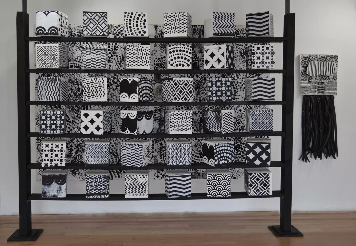The front space is dominated by “The Machine,” a large construction inspired by Tibetan prayer wheels that Yumi made with artist Dave Seiler. On a substantial steel frame painted black are six rows of six cubes mounted on ready-made swivels. The cubes are covered in black-and-white silkscreen prints, and each side has its own geometric pattern that’s half dominated by black and half by white. Viewers are urged to spin the cubes, then interpret the resulting combination of patterns using a handbook that Yumi made for that purpose.