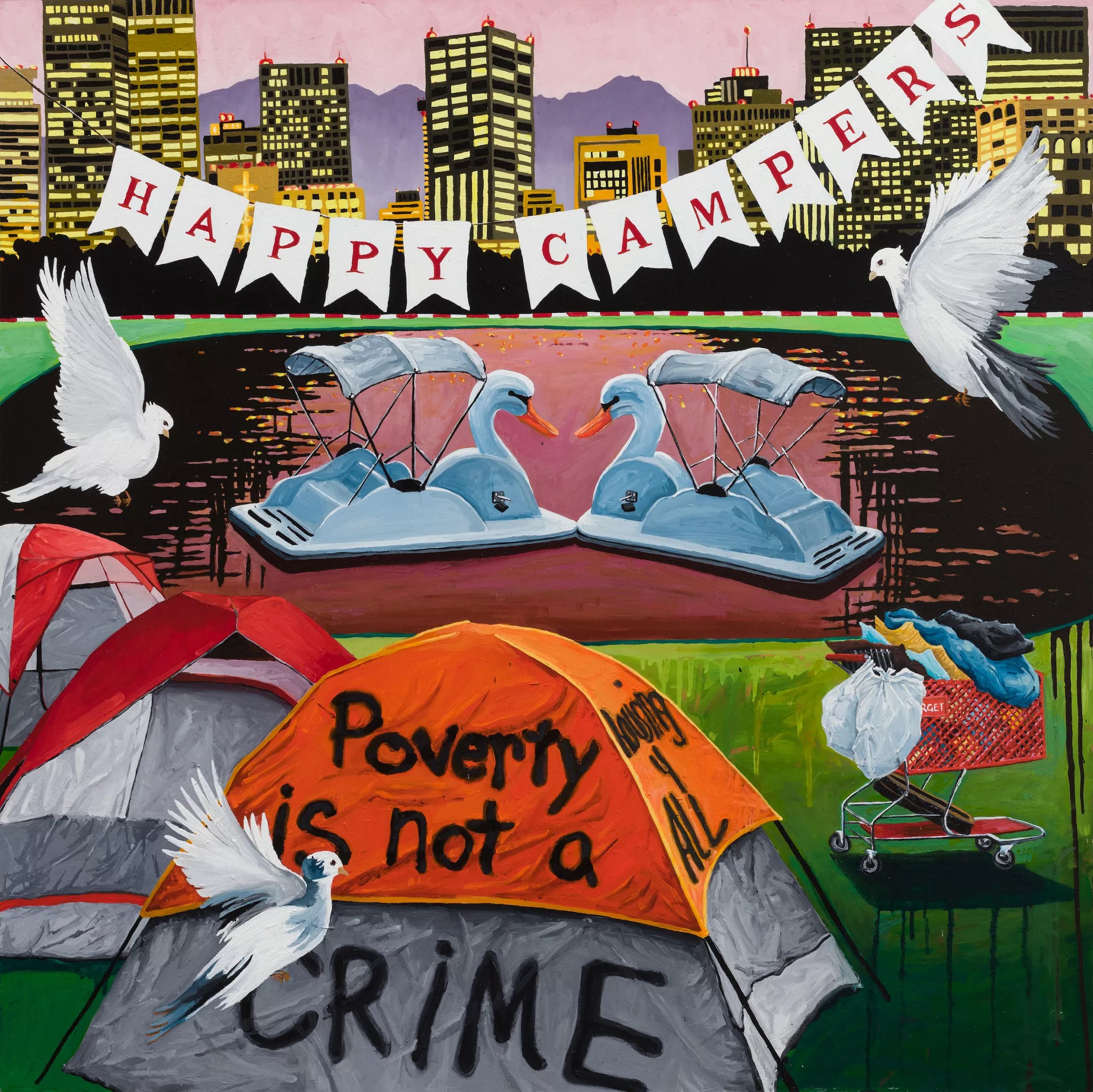 Katie Kidd radiates a pop sensibility visually, with a one-two punch of political messaging that gives her work a deeper edge. Cartoonish religious figures, commercial values, car culture and capitalism’s wage gap mix freely in combinations of oil and acrylics, auto and spray paint, printmaking inks and enamel on paper, wood, fabric, Yupo, vellum and acetate for a street-ready ethos that gives viewers something to think about. During RedLine’s August 19 Satellite Saturday, Kidd will lead an artist tour through the gallery, and fellow artists Andrew Huffman and Matt Tripodi will offer a painting demonstration and class in building stretcher bars from noon to 4 p.m.