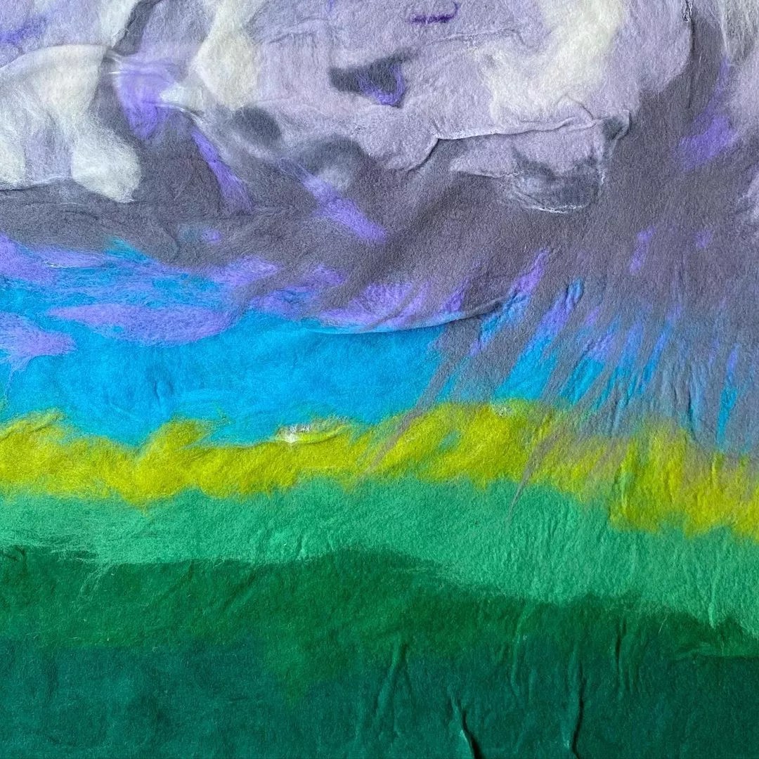 Katy Kidd, Homing Rebecca Peebles, “driving, wild skies out west of the mississippi / leaving the known—house and family and all that is east / flat lands lit from low late day sun / under a theater of thunder, we stopped to look at our map,” greens, cyan, white, grays and lavender dyed wool on silk gauze. Rebecca Peebles