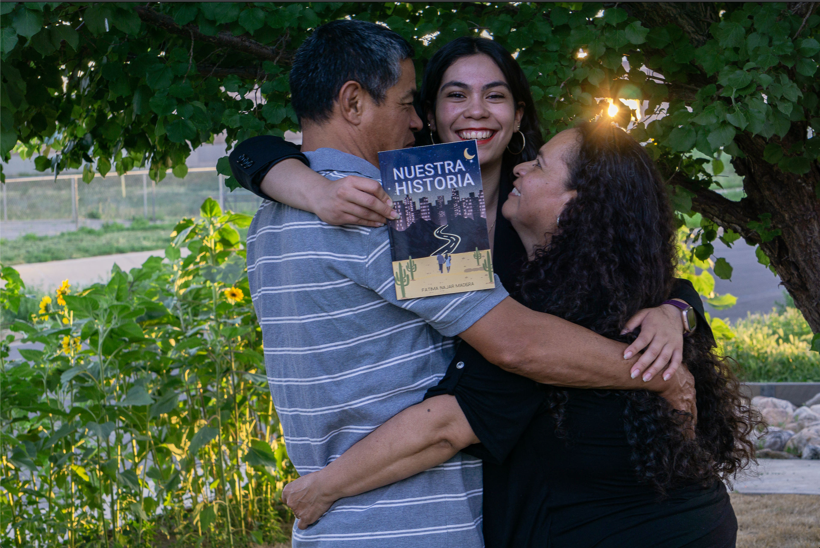 Fatima and her parents embracing one another with the Spanish version of Nuestra Historia.