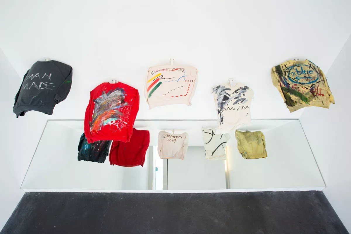 Beyond that, the display has two components: actual pieces by Basquiat and photos of Basquiat and lost pieces he’d created, all taken by Adler. Among the former are sheets from notebooks, some with nothing more than text in his no-frills printing style, which have a poetic, literary quality. The small sketches and drawings feature certain devices, notably the zigzag, that would show up in his signature style of just a year or so later; the quartet of hand-painted T-shirts and sweatshirts likewise anticipate Basquiat’s soon-to-be-famous approach. There’s even a broken Pepto-Bismol bottle he painted on, which was once part of a sculpture-cum-costume. The photos by Adler reveal a teenage Basquiat – he was only nineteen when they lived together. Some show him performing for the camera by shaving half of his head, or putting Silly Putty on his nose; others are beautiful shots taken when he may not have known he was being photographed.