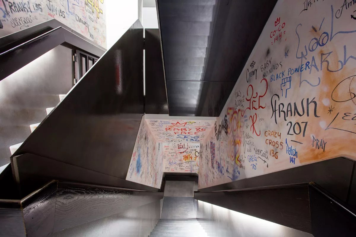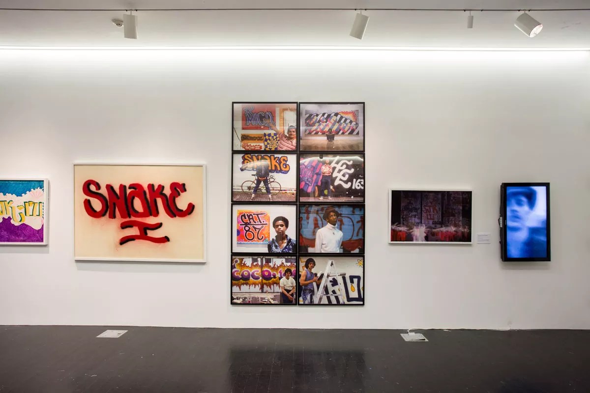 The shows are installed so that you can see them chronologically, starting at the lower level and working up to the top. Since visitors enter the museum on the main floor, which is right in the middle, there was a logistical challenge. The MCA dealt with it imaginatively, teasing the downstairs exhibit, Wall Writers: Graffiti in Its Innocence, on the entry level by bringing in Chris Pape, a famous graffiti writer known as Freedom and renowned for his work in New York’s notorious Freedom Tunnel, to cover the walls lining the staircase that heads down to the lower level. A wash was applied to dingy-up the formerly white walls, and then Freedom spent days covering them with a dense, all-over arrangement of tags done in a range of colors and using different methods. It looks as though hundreds of individuals created the display over a long period of time; as you descend the stairs, it’s like going into a subway station in an iffy area.