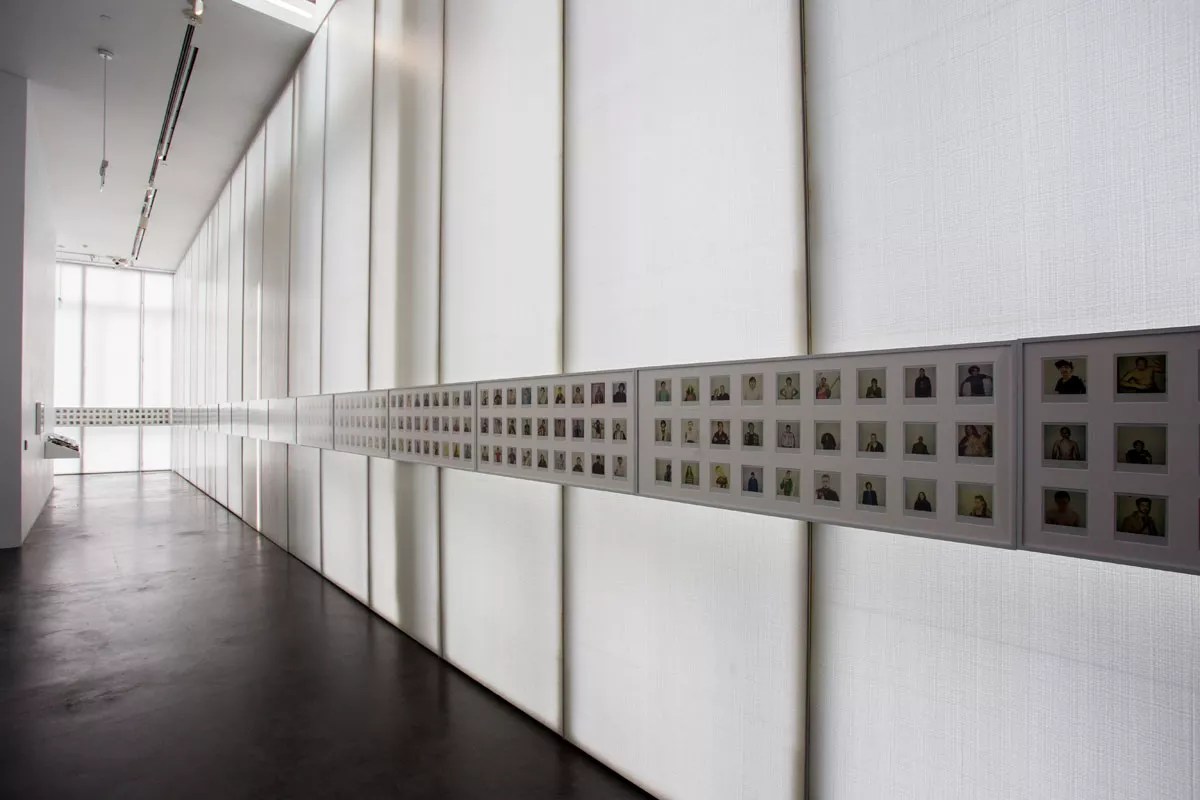 This show, too, was curated by Abrams. Stepping off the elevator, you encounter a remarkable installation: An acrylic band of panels running around two-thirds of the top floor is covered with 1,500 Polaroids that McGinley took of his friends in posed portraits. The lineup is heavy on shirtless beefcake shots of his young pals among a broader assortment of people from the scene. Many focus on a close friend, Dash Snow, who was a photographer and collage artist. These photos, which once adorned the walls of McGinley’s apartment, have never been publicly exhibited, and that’s also the case with many of the large-format color prints, also typically posed portraits of members of his crowd
