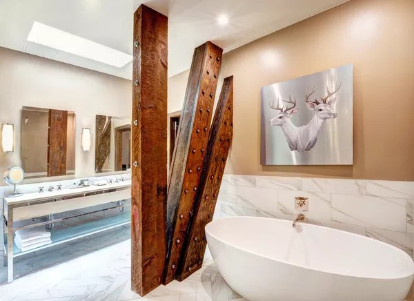 The Catbird Art can be found throughout The Crawford Hotel, even in the bathrooms, such as this painting on metal by Mai Wyn Schantz called “Seneca Deer.” Courtesy of The Crawford Hotel