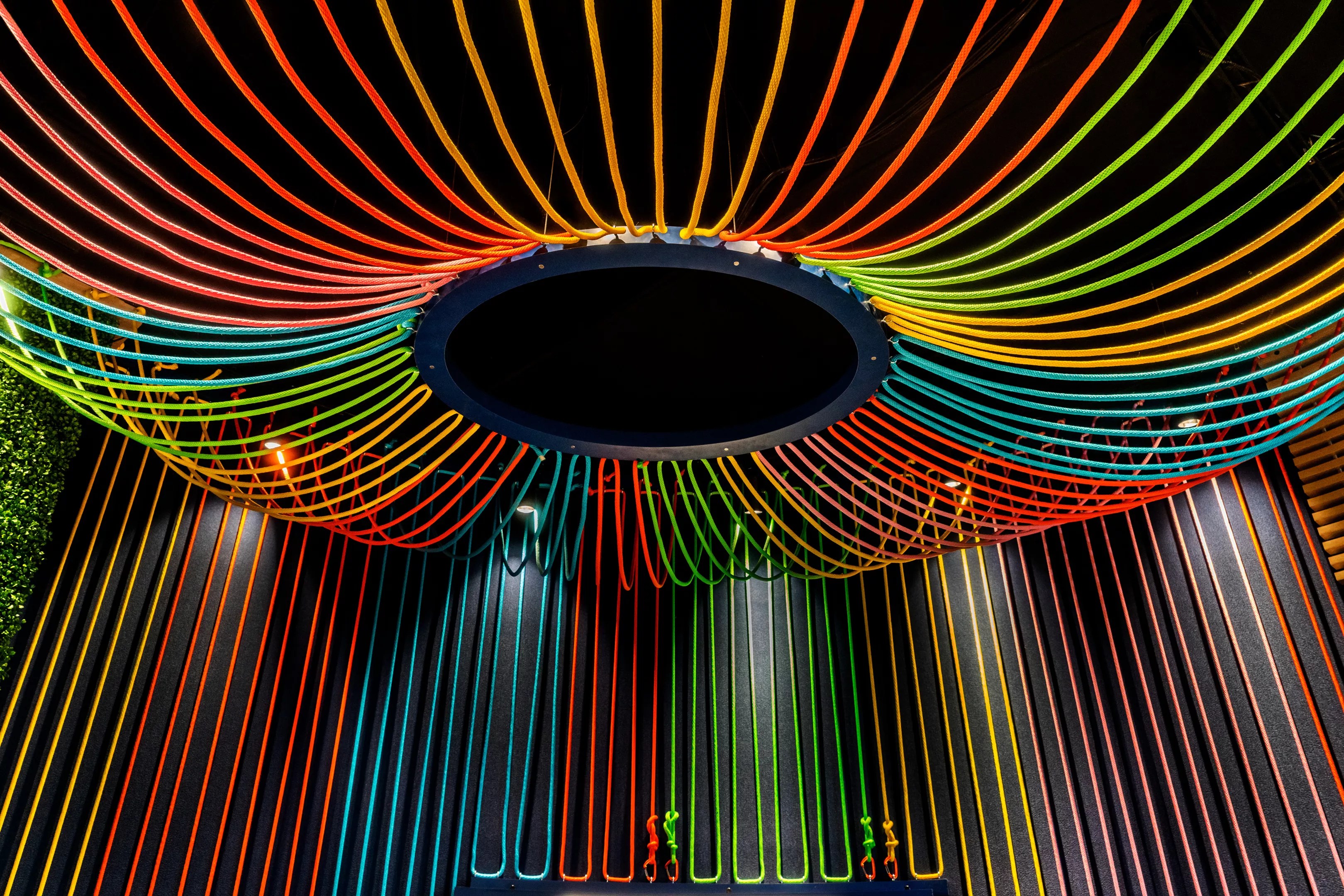 The Crawford Hotel “Rope Canopy” at The Curtis Denver was designed by DLR Group and fabricated by DH Schmidt Co. The project was commissioned for the Curtis, a Doubletree by Hilton Hotel. Courtesy of The Curtis Hotel