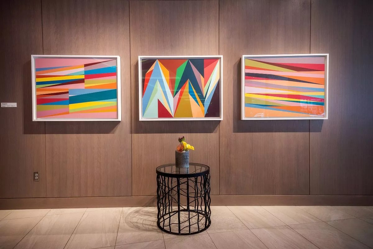 From left to right, three pieces from artist Odili Donald Odita hang in a walkway in the Art Hotel: “Expand,” “Flashpoint,” and “Window.”