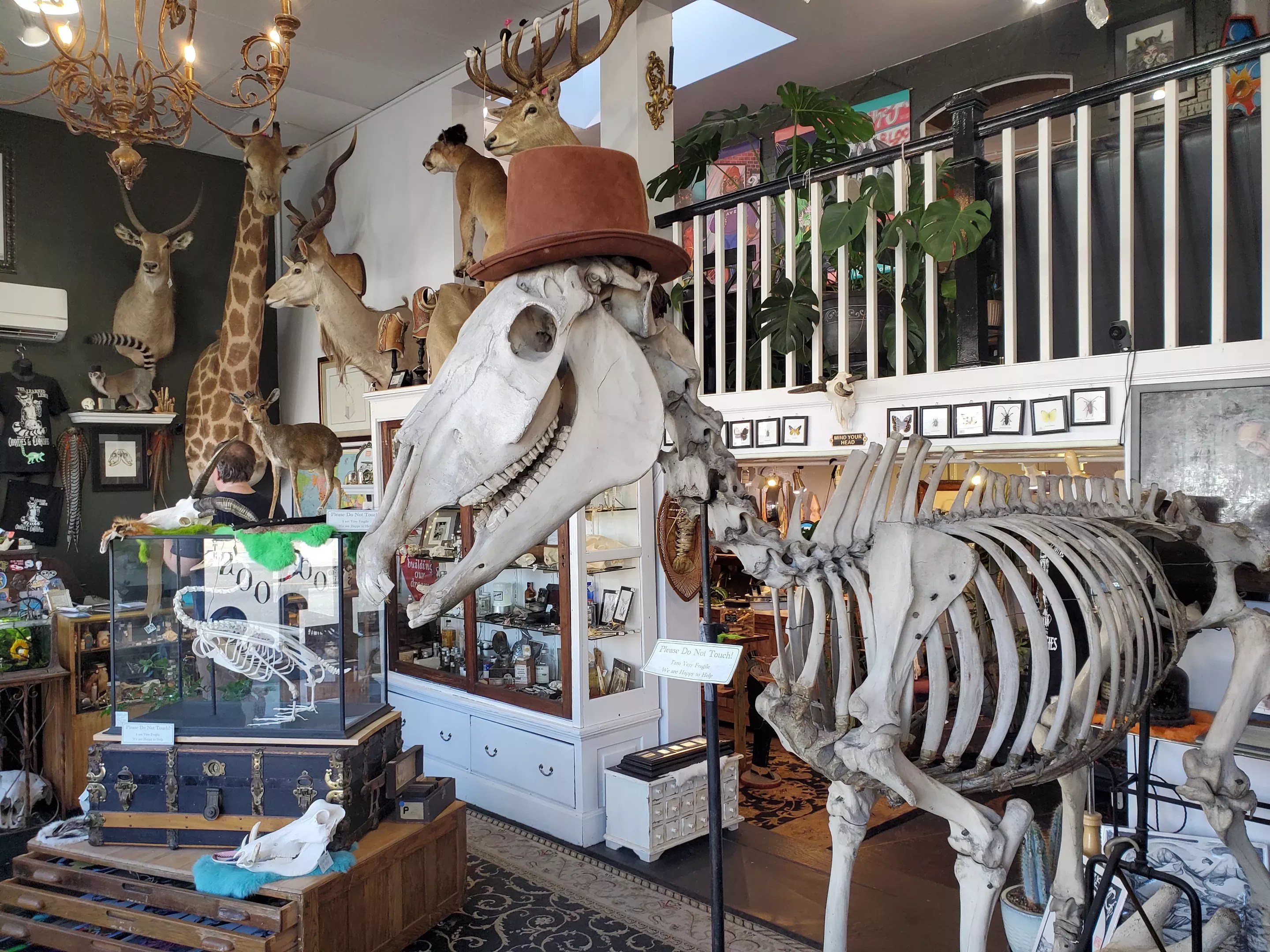 Thousands of items await inside, but a keen eye will guide you to the good stuff, whether it’s a locked-up case showing off animal remains (skulls and bones, not roadkill) or a larger, open-air space where taxidermy hangs. If you keep your wits about you, you’ll also be privy to find some original weirdo art that incorporates both.