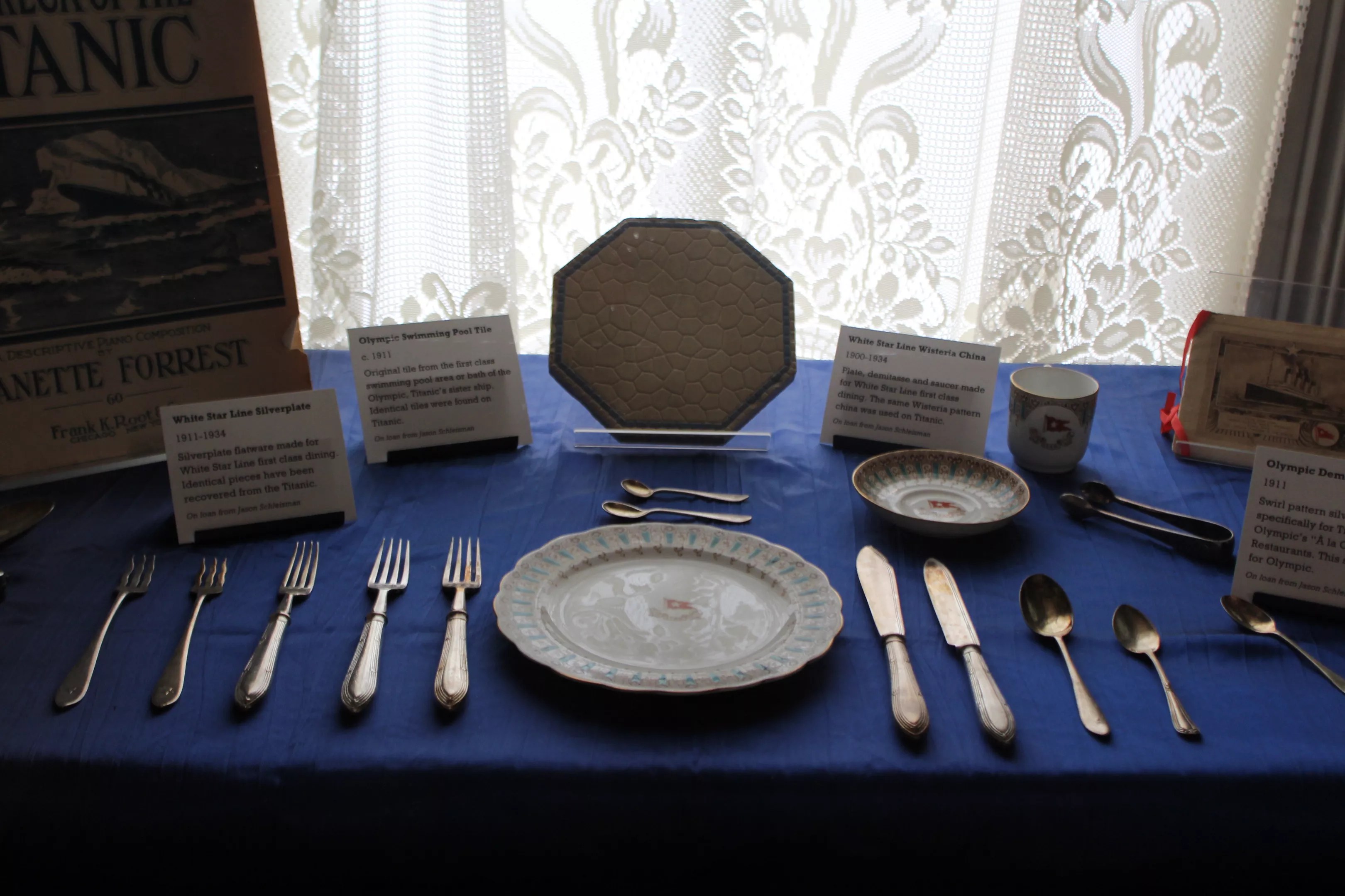 China and silverware from the Titanic’s sister ship, the Olympic. “The Olympic went on until it was decommissioned after World War II, so lots more exists of it because it’s not at the bottom of the ocean,” Malcomb says.