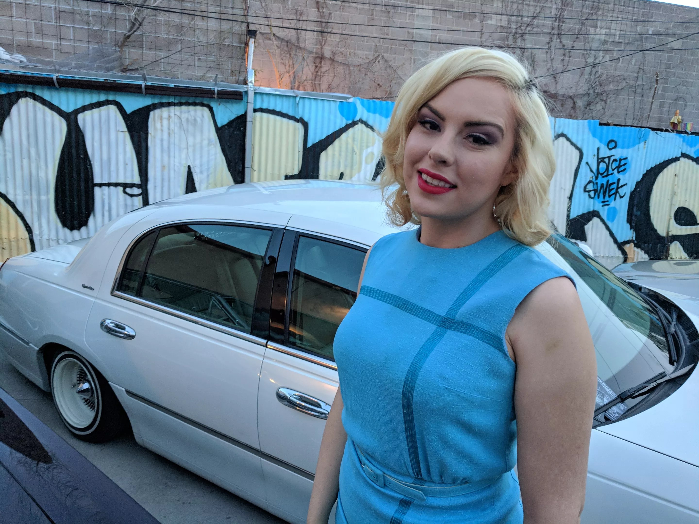 Betty Garcia channels Marilyn Monroe in this baby-blue dress from La Chic Thrift and Vintage.