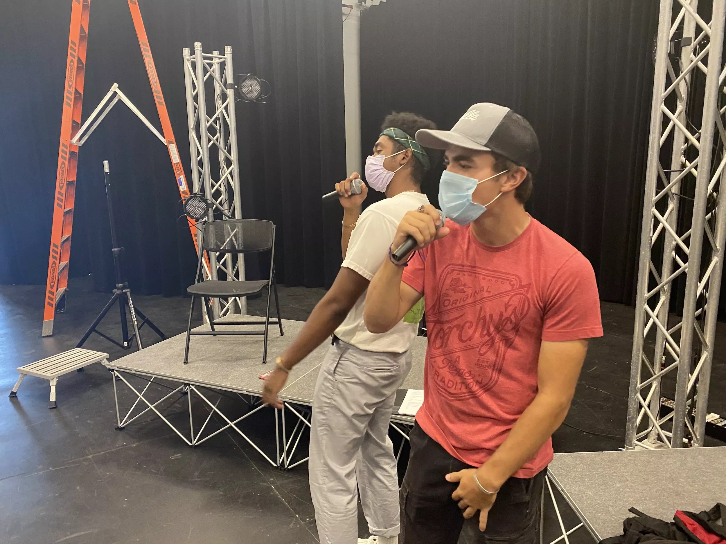 Mykail Cooley and Baris Loberg practice rhymes and poses for Hype Man at the People’s Building.