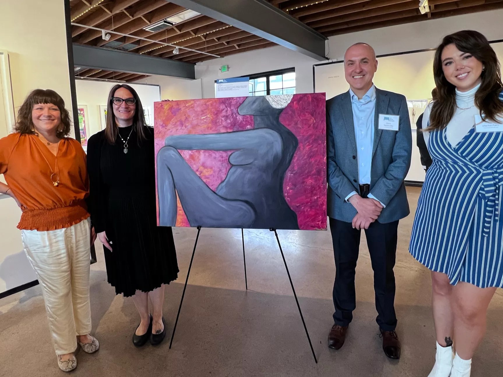 Megan Carvajal, Jenn Merz, David Proper and Elizabeth Carpio standing next to one of Merz’s paintings at the 2022 RISE.