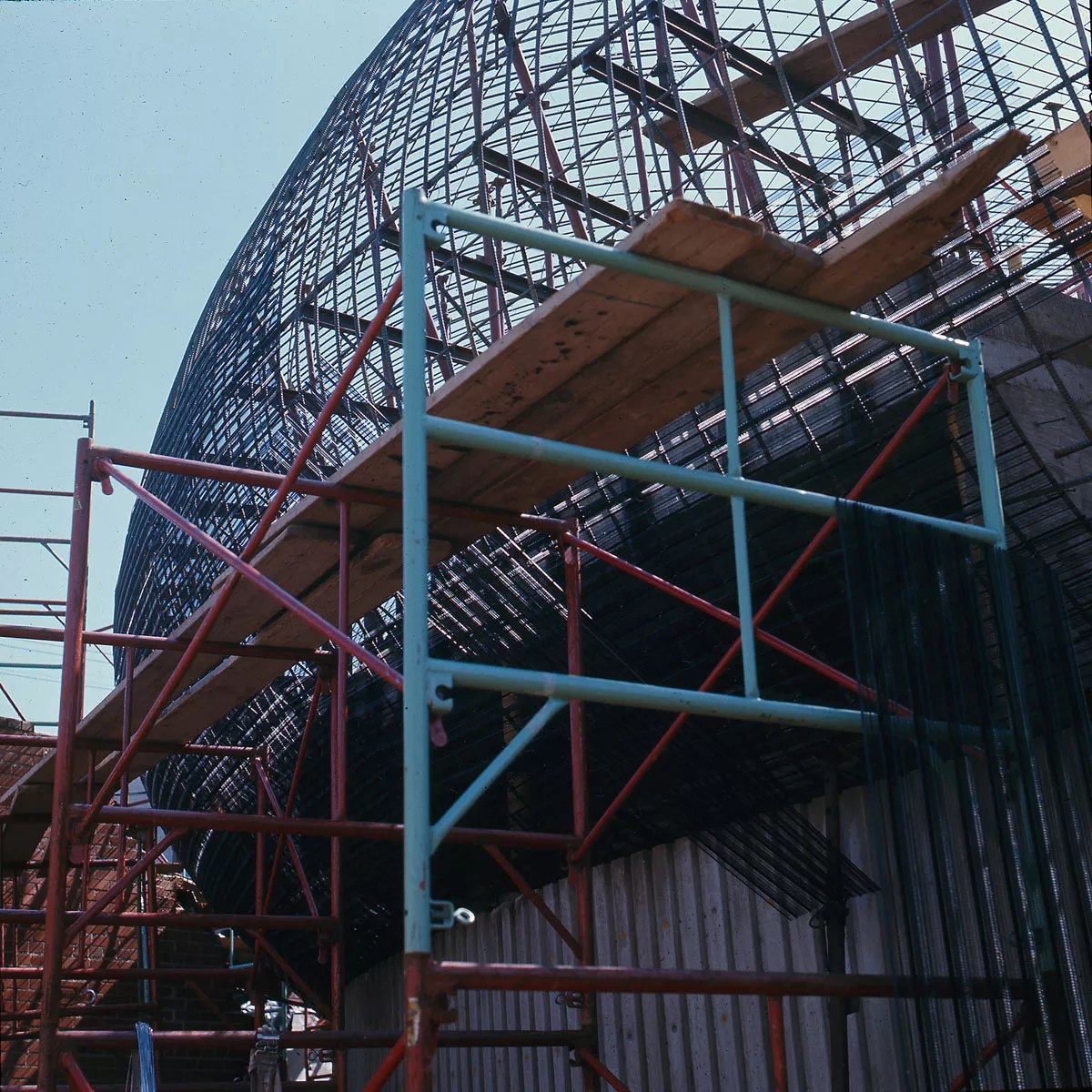 The model is surrounded by graphic panels that tell the stories behind the Englewood structure, “Sculptured House” and another bank, this one in Casper, Wyoming. The show also includes photos, among them construction shots that reveal the tremendous armatures needed to pull off these organic abstractions masquerading as buildings. There are reproductions of Deaton’s stunning presentation drawings done freehand in colored pencil on flat black paper, as well as reproductions of the structural drawings, which remind us that architects and engineers used to employ compasses and slide rules instead of computers, making Deaton’s creations all the more astounding. The original plaster model made in 1965 for Charles Deaton Courtesy of the Museum of Outdoor Arts