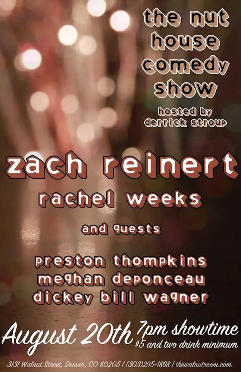 While the classy stage at downtown Denver’s Walnut Room typically hosts bustling musical performances, the venue has recently branched out into standup with the Nut House Comedy Show. Booked and hosted by Alabama transplant Derrick Stroup, the Nut House has only been operational for a few short months, but has already welcomed some of Denver’s funniest people to the mic. August’s lineup includes local mirth merchants Dickey Bill Wagner, Preston Tompkins, Meghan DePonceau and Rachel Weeks opening up for headliner Zach Reinert. Admission is $5 via Ticketfly.