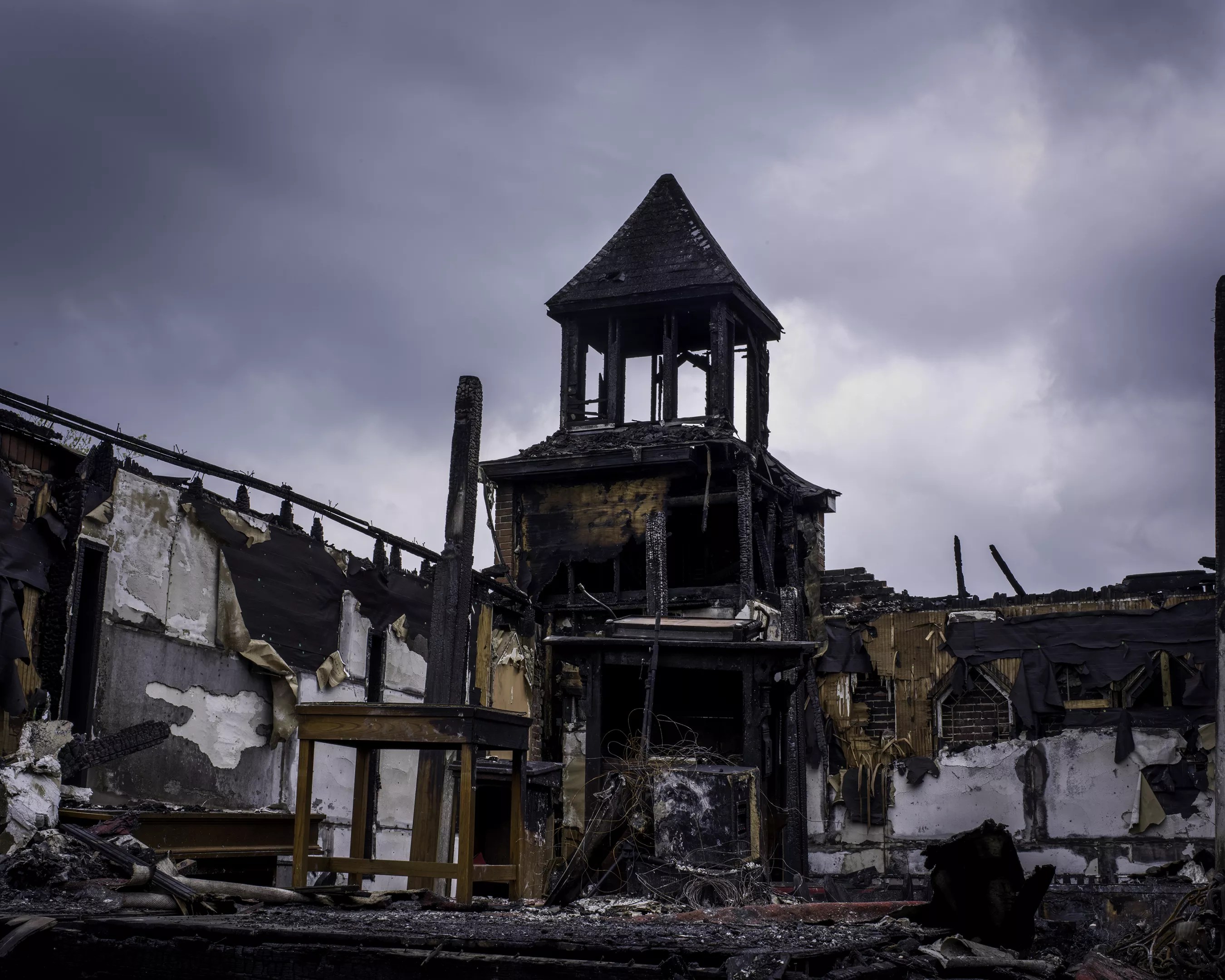 The burned interior and steeple of Mount Pleasant Baptist Church.