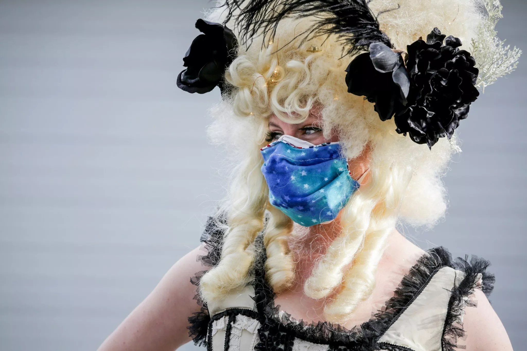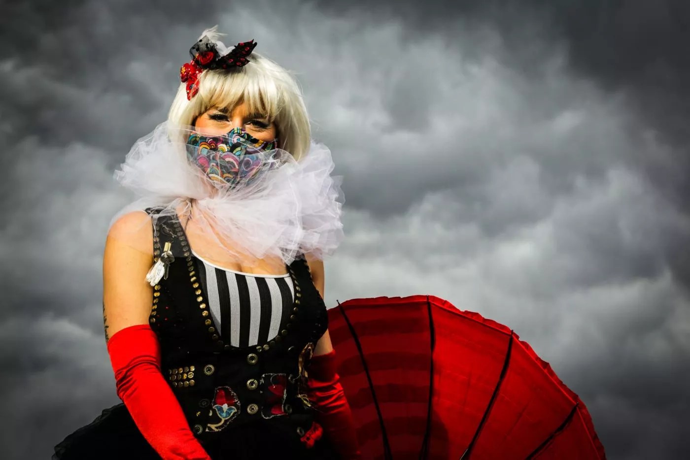 Project Joy Bomb performer Staza Stone is masked up and ready to go.