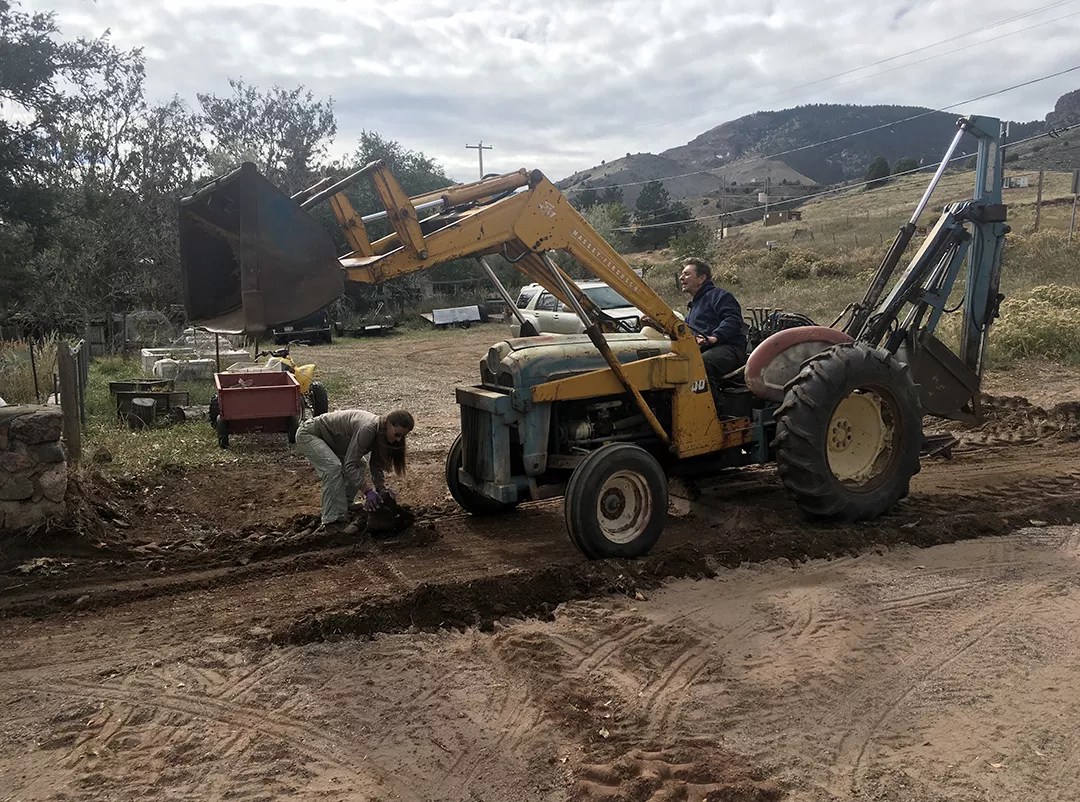 Sabin Aell and Randy Rushton move earth for their permaculture project.