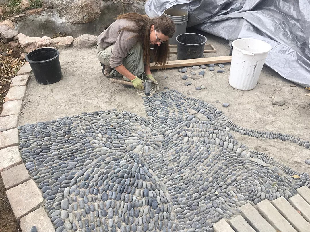Sabin Aell builds a pebble-mosaic patio at Neu Hinterland in Morrison.