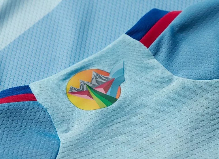 Milbery, who has lived in Colorado for more than twenty years, says that the natural environment, including those blue skies, has helped his own mental health improve. It also inspired the sign-off on the back of the jersey; the design sets mountains atop an orange circle, with colorful shapes that symbolize the flow of a river. According to Rothrock, that insignia and the heart at the bottom of the jersey were entirely up to the club, so Milbery had full artistic freedom on that end.