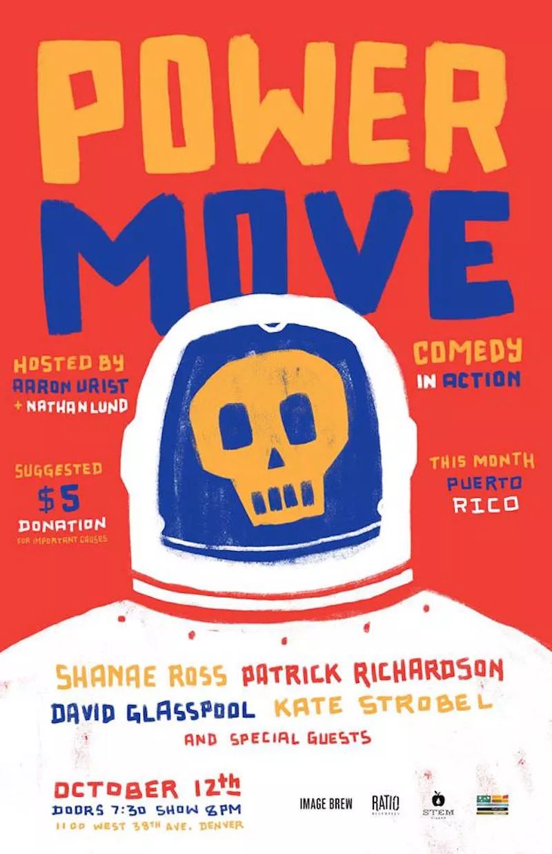 Among programming at the city’s most unconventional comedy venues, shows at Image Brew studios thrive because of a collaborative spirit of goodwill. That tradition, started by Denver expat Mara Wiles’s Funnyside Sessions showcase, continues at Power Move. Co-created by Denver comics Nathan Lund and Aaron Urist, Power Move is a monthly showcase that combines standup with sketch comedy and puts the “fun” into fundraiser. Each month, Lund and Urist solicit a suggested $5 donation to benefit a different worthy cause. Join them, along with local comics Patrick Richardson, Kate Strobel, David Glasspool and ShaNae Ross, as they help raise funds for storm relief efforts in Puerto Rico, with a suggested minimum donation of $5. Visit the Facebook event page to learn more.