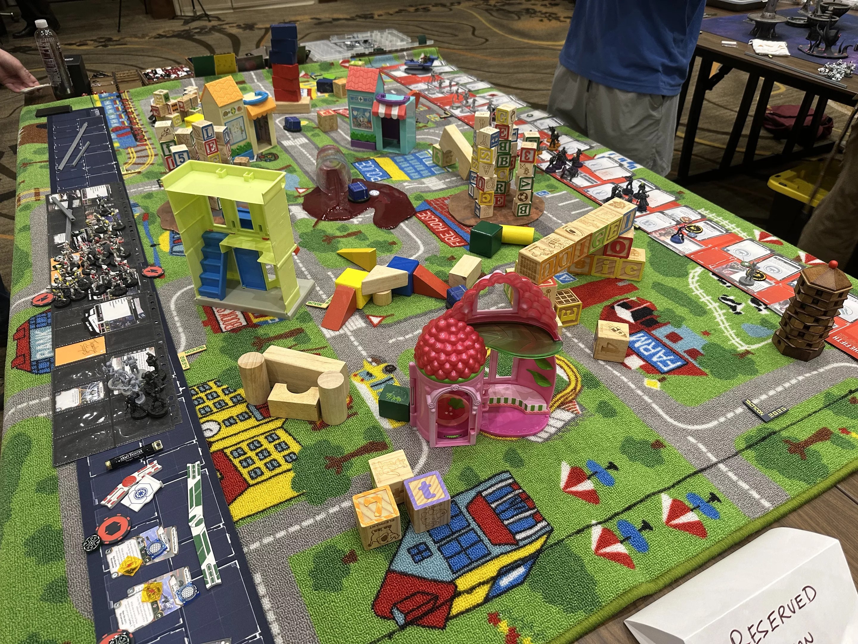 Yes, model-crafting is not for young kids – but kids don’t care anyway. This map harkens back to those days when gamers just grabbed any old thing in the toy box that would serve as a place for battles to take place. From old-school building blocks to what looks to be a Strawberry Shortcake house, this was clearly a skirmish for the ages. Extra points for the fake-spilled drink smack in the middle. At least we’re pretty sure that’s fake.