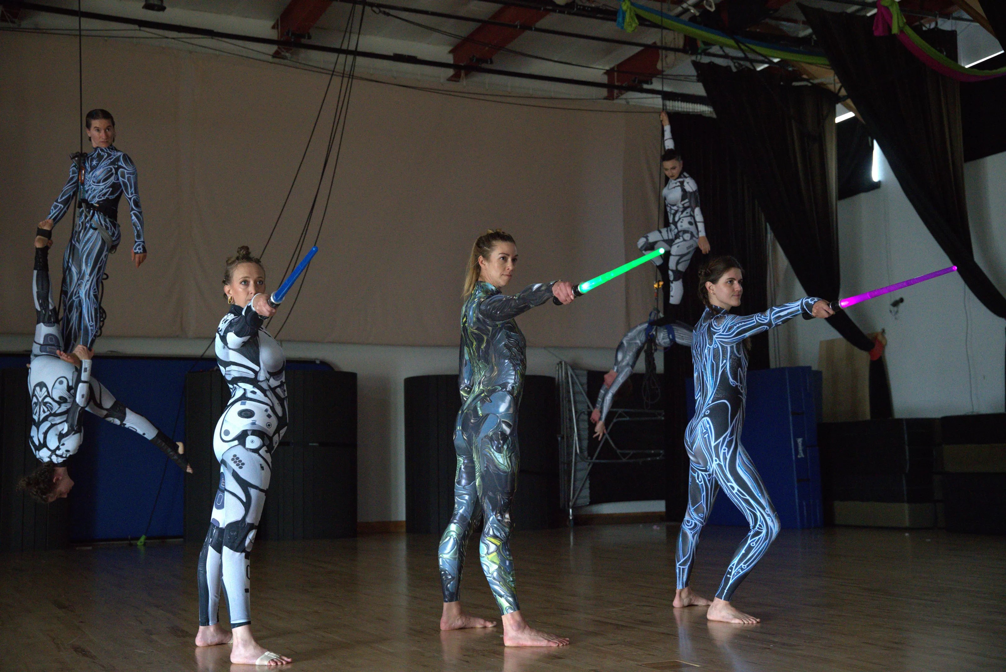 Dancers pose with lightsabers during a rehearsal for Embers, Petals, & Stars.