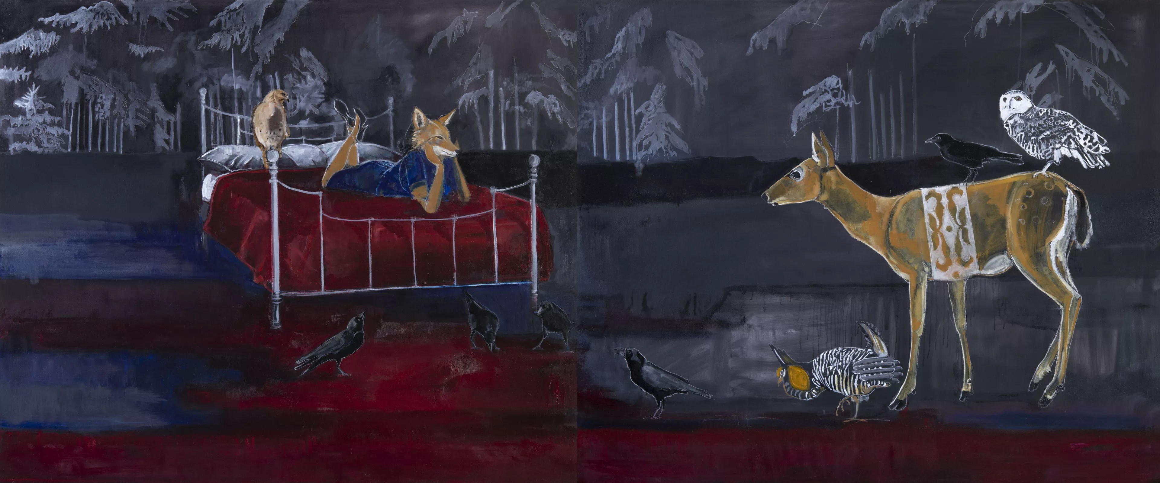 Upstairs on the fourth level is Eyes On: Julie Buffalohead, curated by John Lukavic and Denene De Quintal. The updated magic-realist paintings were created specifically for the show by Julie Buffalohead, an enrolled member of the Ponca tribe of Oklahoma. In them, she explores her childhood memories through the animal symbolism of the Ponca clans, and also takes on current topics, especially the environment. Julie Buffalohead’s “Straight Legs,” oil on canvas. Courtesy of Julie Buffalohead and Bockley Gallery