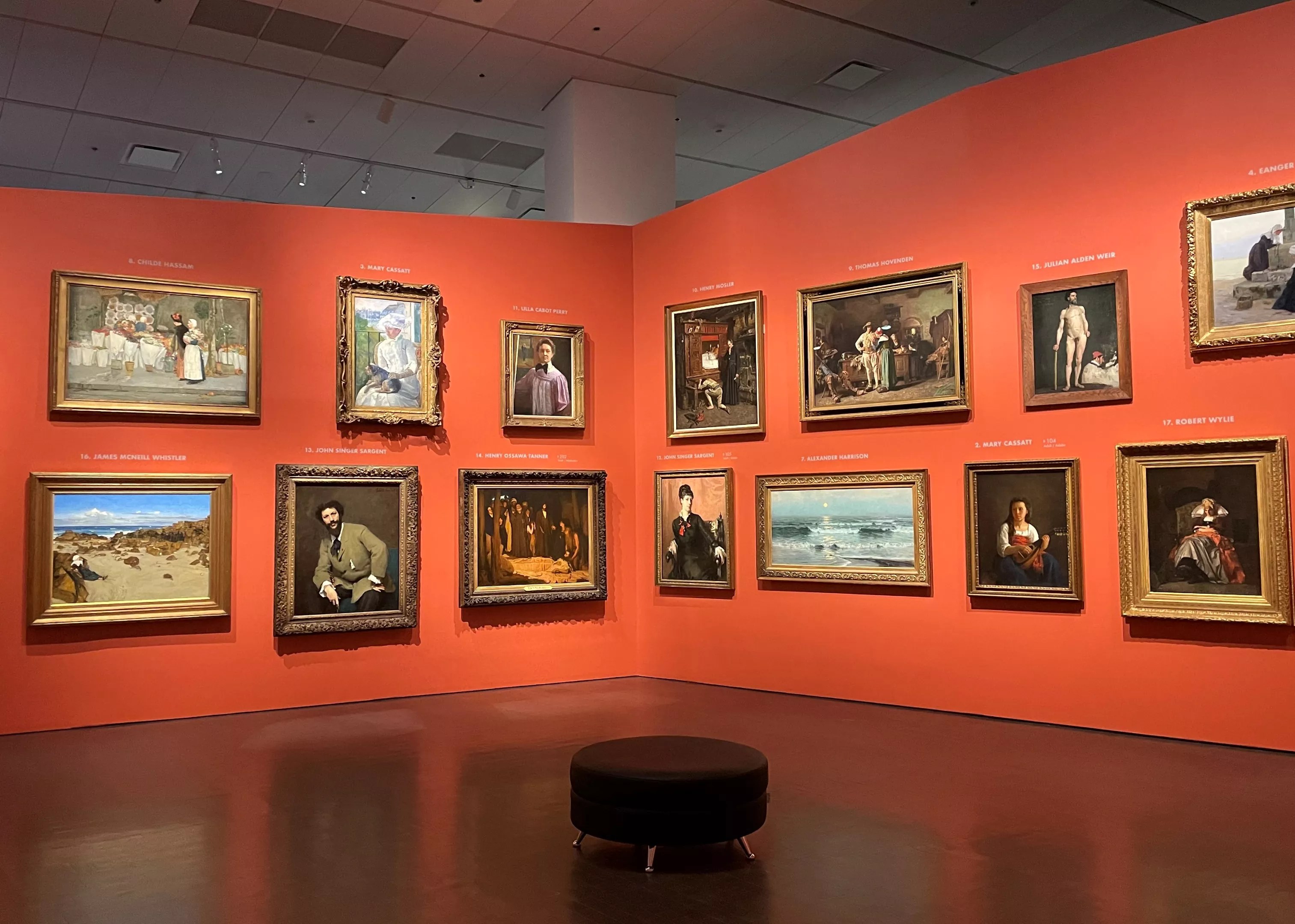 Standring explains that American artists wanted to go to France because of its art infrastructure, including not only the official and private academies, but individual mentor artists who offered instruction. Their teaching methods were traditional, with students charged with copying paintings, as shown by James Abbott McNeill Whistler’s gorgeous rendition of “Roger delivrant Angelique” by Ingres, or drawing antiquities, such as the John Singer Sargent depiction of a Roman plinth. (There are so many wonderful Sargents in the exhibit that he could easily have been name-checked in the title alongside Whistler and Cassatt.) The artists could then translate the skills they’d learned into their own works, as Cecilia Beaux does when she turns a friend into a Greek sculpture in the very erotic “Standing Male Figure.” Successfully completing these technical lessons could lead to an artist’s acceptance in the important salon exhibitions, which brought with them interest from collectors, dealers, curators and critics – thus credentialing an artist back in America’s galleries, money in the bank. Salon hanging in Whistler to Cassatt. Robert Delaney