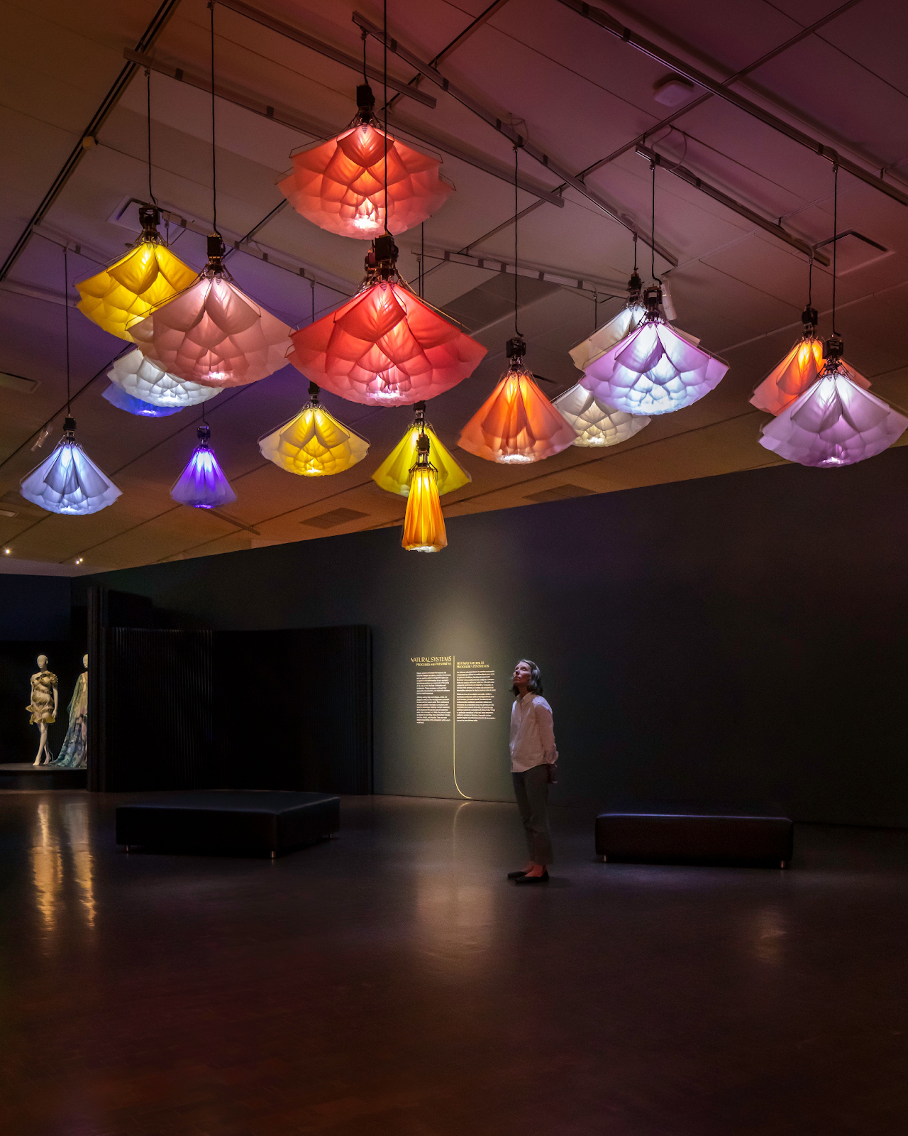 “Meadow,” by the Dutch arts collective DRIFT, is an installation of mechanical flowers suspended bloom side down from the ceiling and illuminated from within. From the vantage point of the ground, viewers gaze into the giant flowers, which expand and contract as they might in different light or stages of bloom, but at an amplified scale and pace. Like several other pieces in the show, the art magnifies a natural pattern that is nearly imperceptible to us in our daily lives, unless we were to look very closely for a long, uninterrupted period of time.