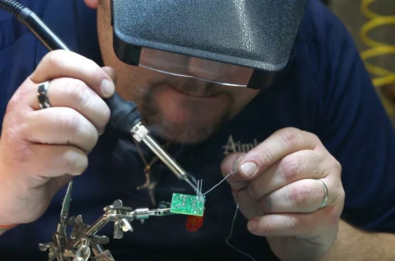 Not at all your typical artist, Tesla-loving techie Charles Russell fell into his mad-scientist oeuvre while tinkering with electronics and found parts from thrift stores. The resulting sculptures, inspired by his background in history and technology, were and still are weirdly retro and interactive and intriguing to fellow tinkerers and curious audiences. Is Russell a newfangled brand of nerdy artist who’s deeply entrenched in twentieth-century design? You be the judge, after reading his answers to the 100CC questionnaire. Charles Russell builds an imaginary circuit for a new work. Courtesy of Charles Russell