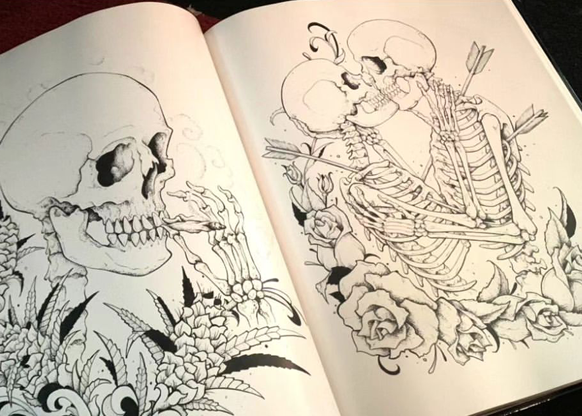 “The book, with the illustrations and the art, kind of portrays that,” he admits. “It just shows the perspective of the outlaw, and the drug addiction and all sorts of stuff like that. That’s why I don’t really push it out here – a lot of it is something that I really wouldn’t want to tattoo now – but it is what it is, and it’s part of the journey.”