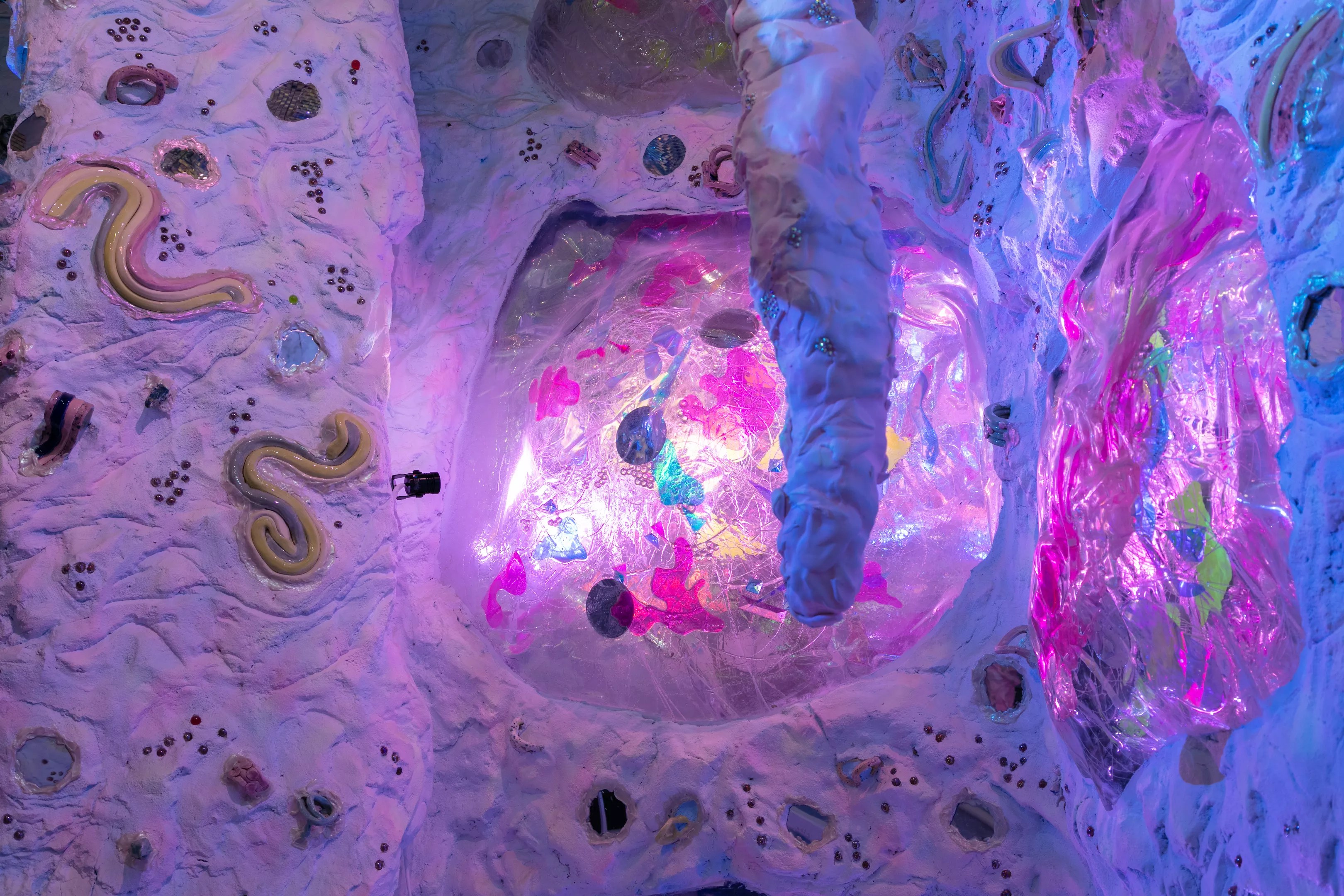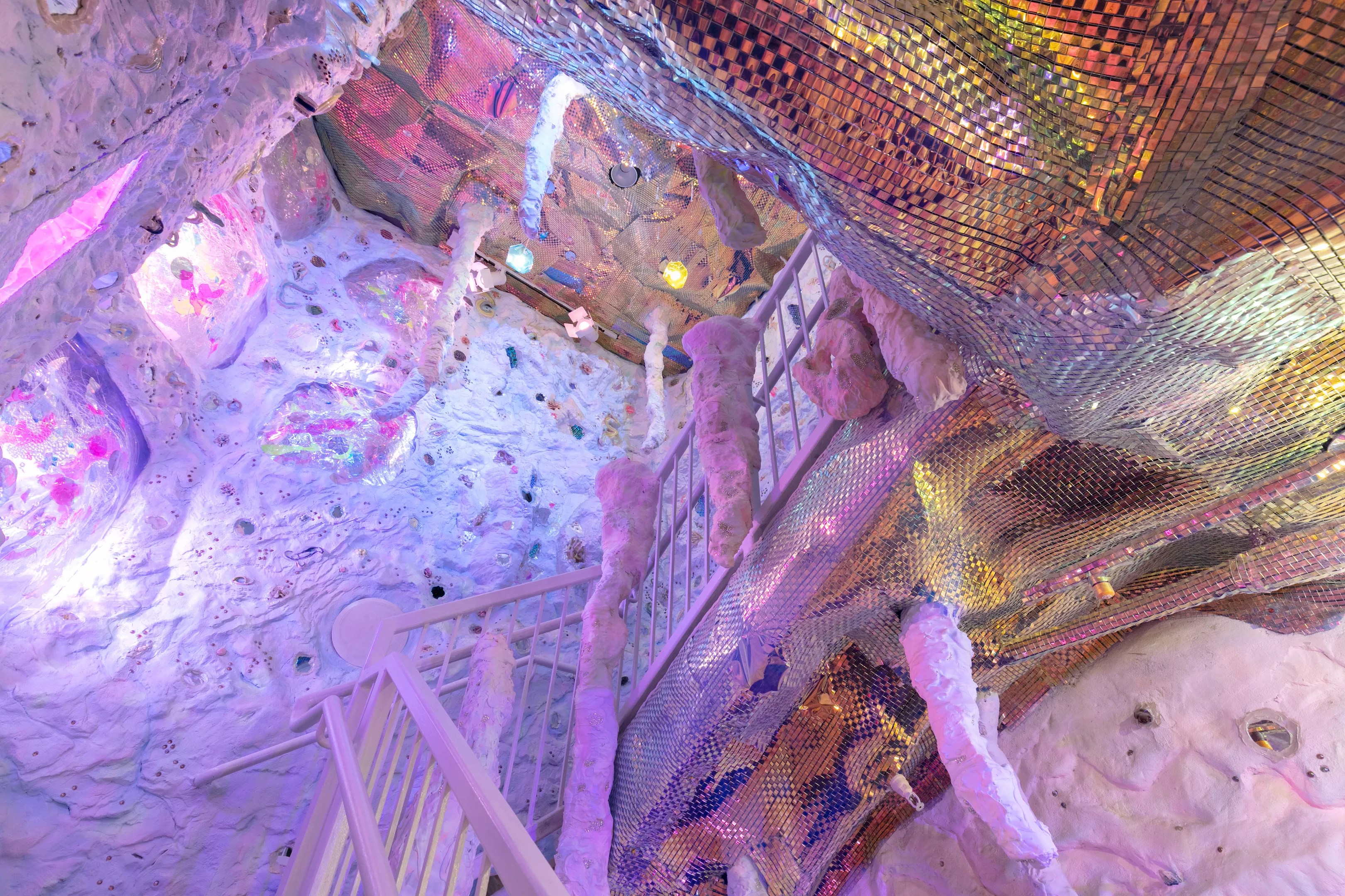 “Sparkle Cave” is “nature in drag,” says Cohn. It’s a two-story kaleidoscope of colors and textures embedded into the walls of a brightly lit and playful space that easily belies the years of physical work and planning she put into the whimsical creation.