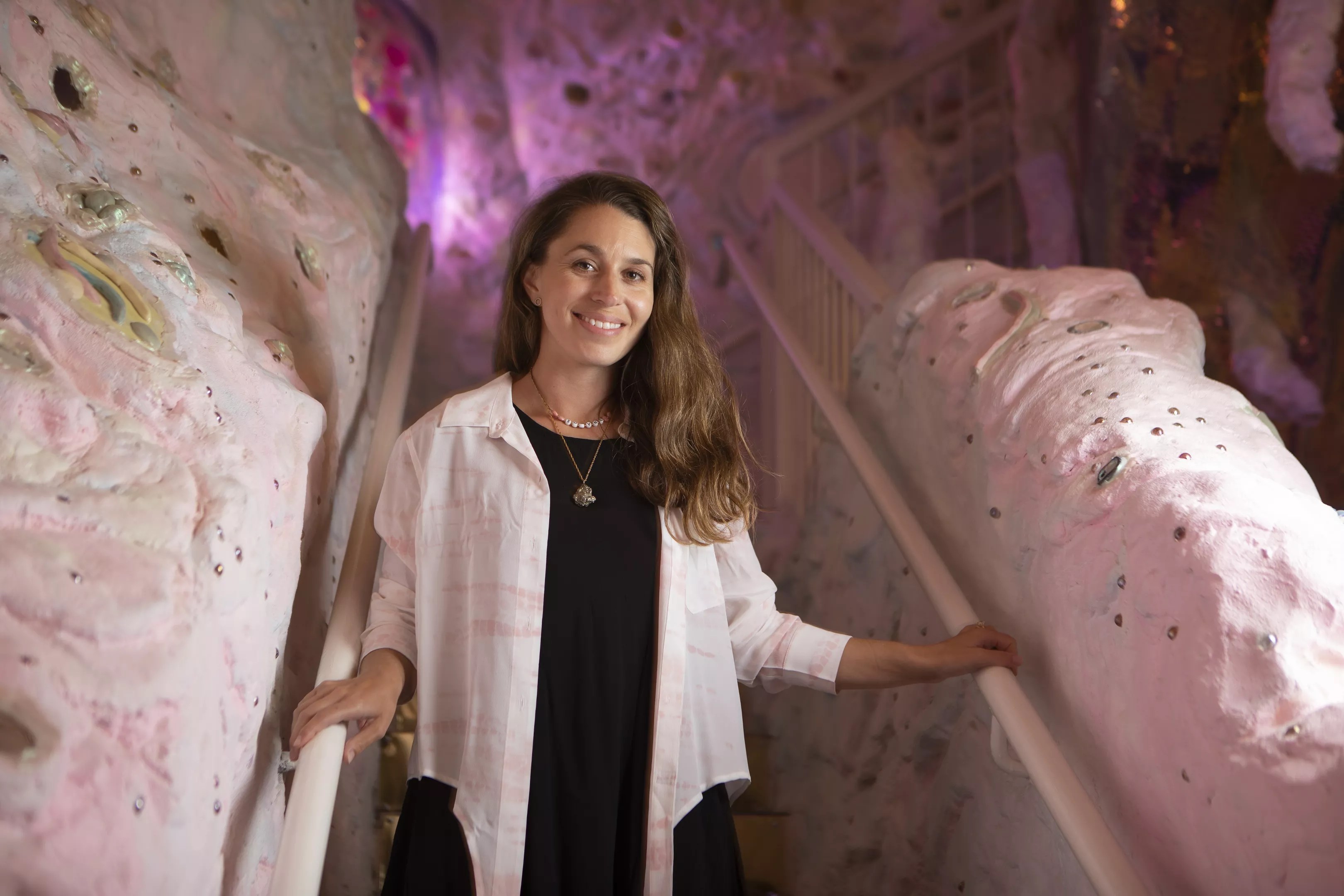“Sparkle Cave” is “nature in drag,” says Cohn. It’s a two-story kaleidoscope of colors and textures embedded into the walls of a brightly lit and playful space that easily belies the years of physical work and planning she put into the whimsical creation.